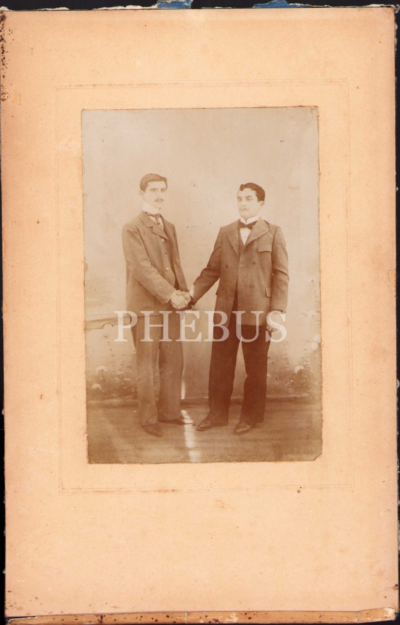 Tokalaşan iki beyefendi, arkasında 1318 tarihli Osmanlıca ithaf yazısı mevcut, Osmanlıca Ahmed Nizameddin damgalı, foto: 9x14 cm, paspartusu hafif yıpranmış haliyle
