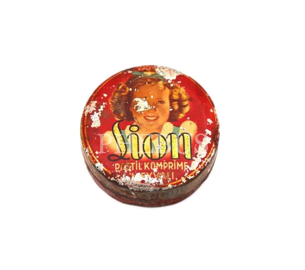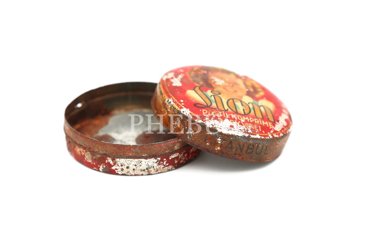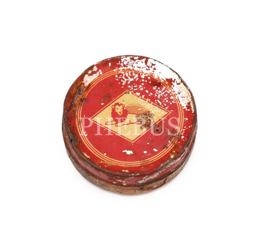 Lion Çikolata ve Şekerleme Fabrikası teneke kutu, 2x5 cm, yıpranmış haliyle
