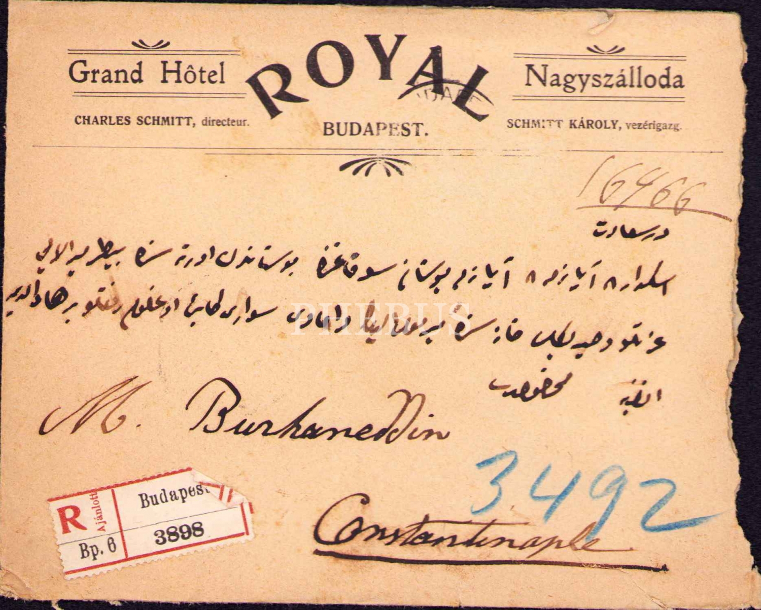 Royal Hotel-Budapeşte antetli kâğıt ve zarfta 1319-20 tarihli üç adet Osmanlıca şahsi mektup, 22x30 cm, zarfı epey yıpranmış haliyle