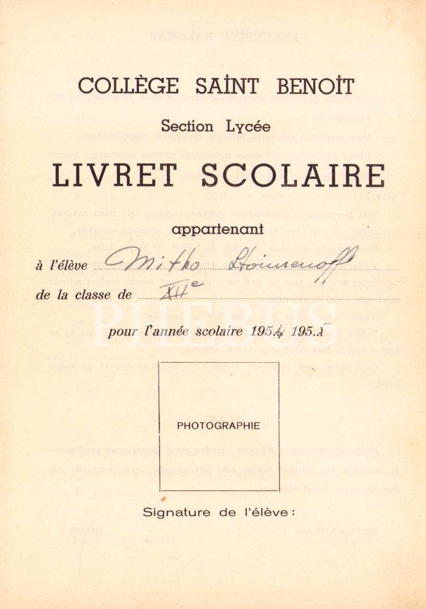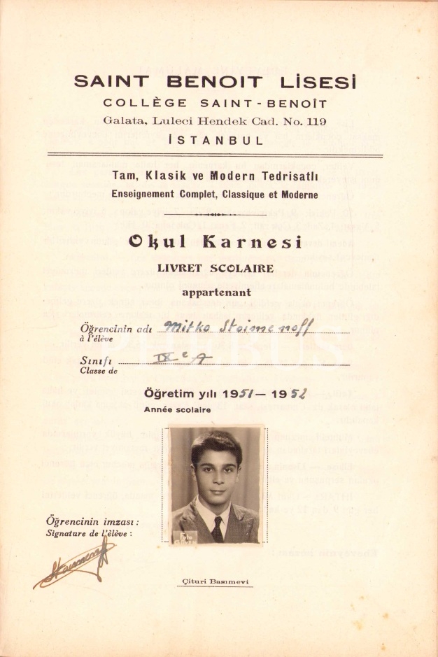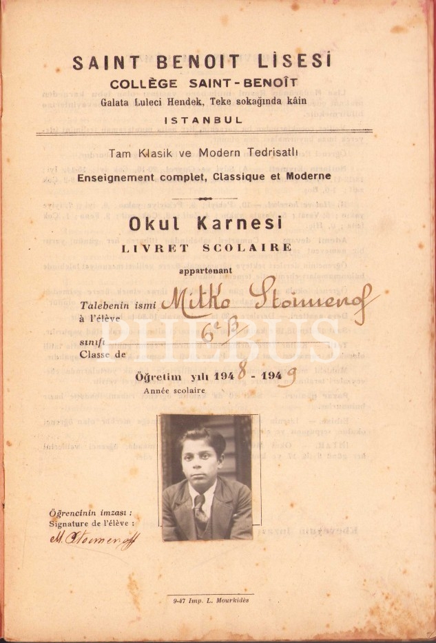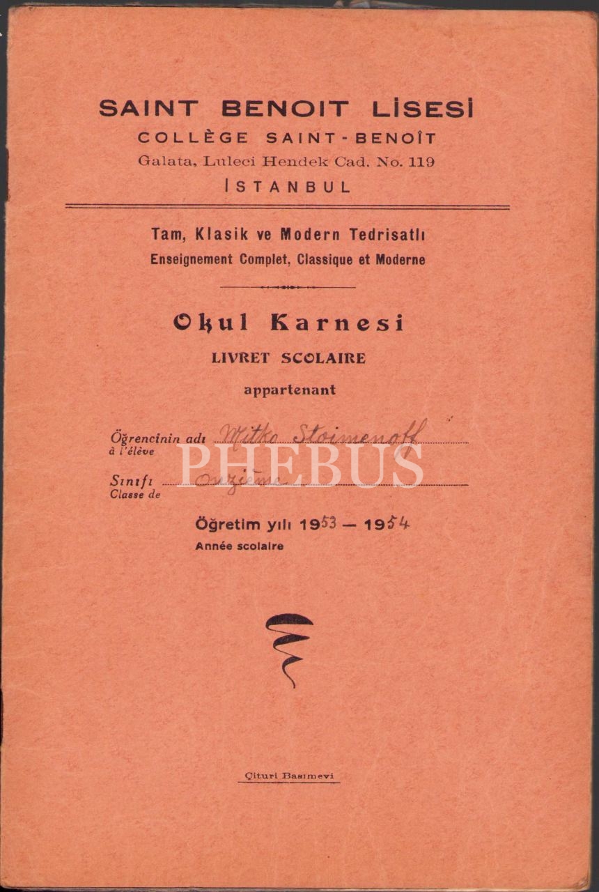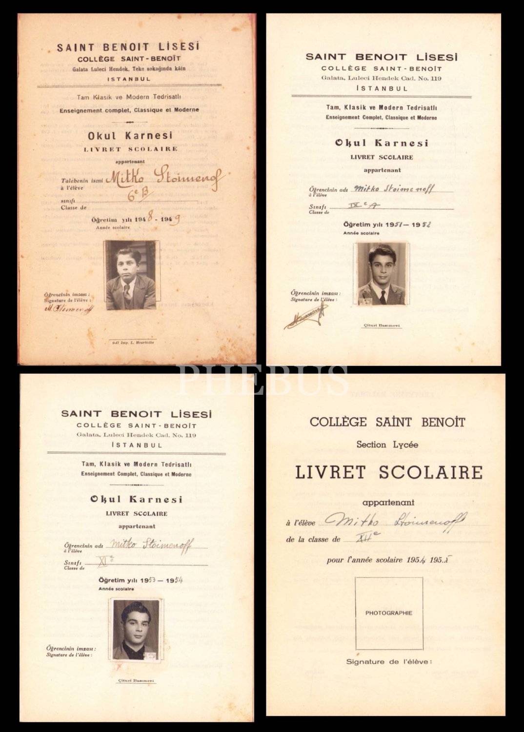 Saint Benoit Lisesi'ne ait üçü fotoğraflı olmak üzere dört adet okul karnesi, 1948-55 yılları, 15x23 cm, kapakları hafif yıpranmış haliyle