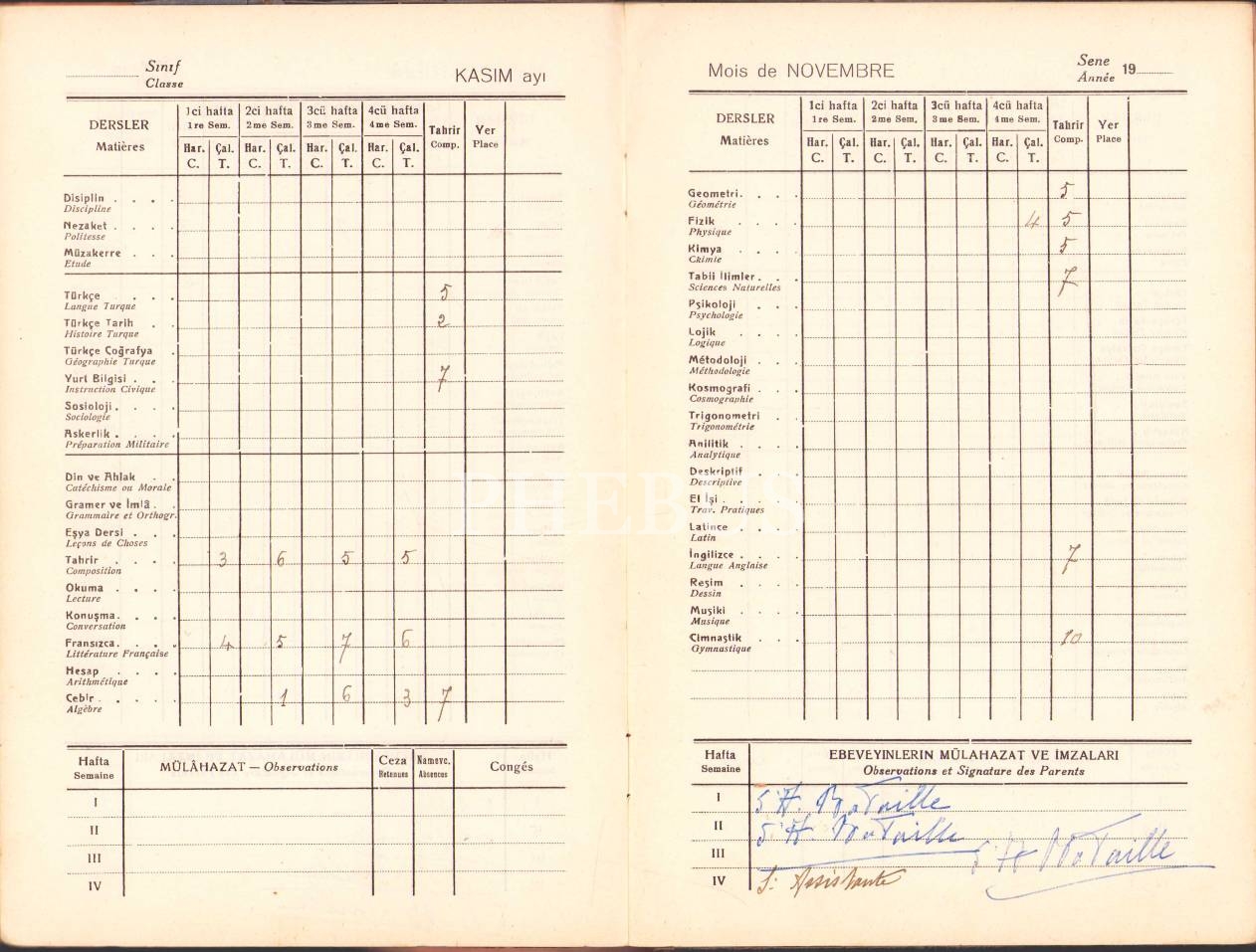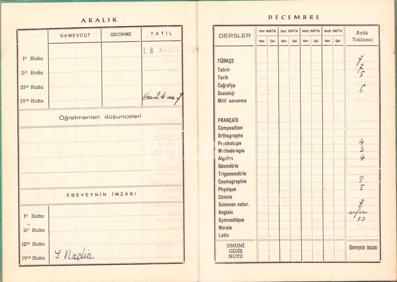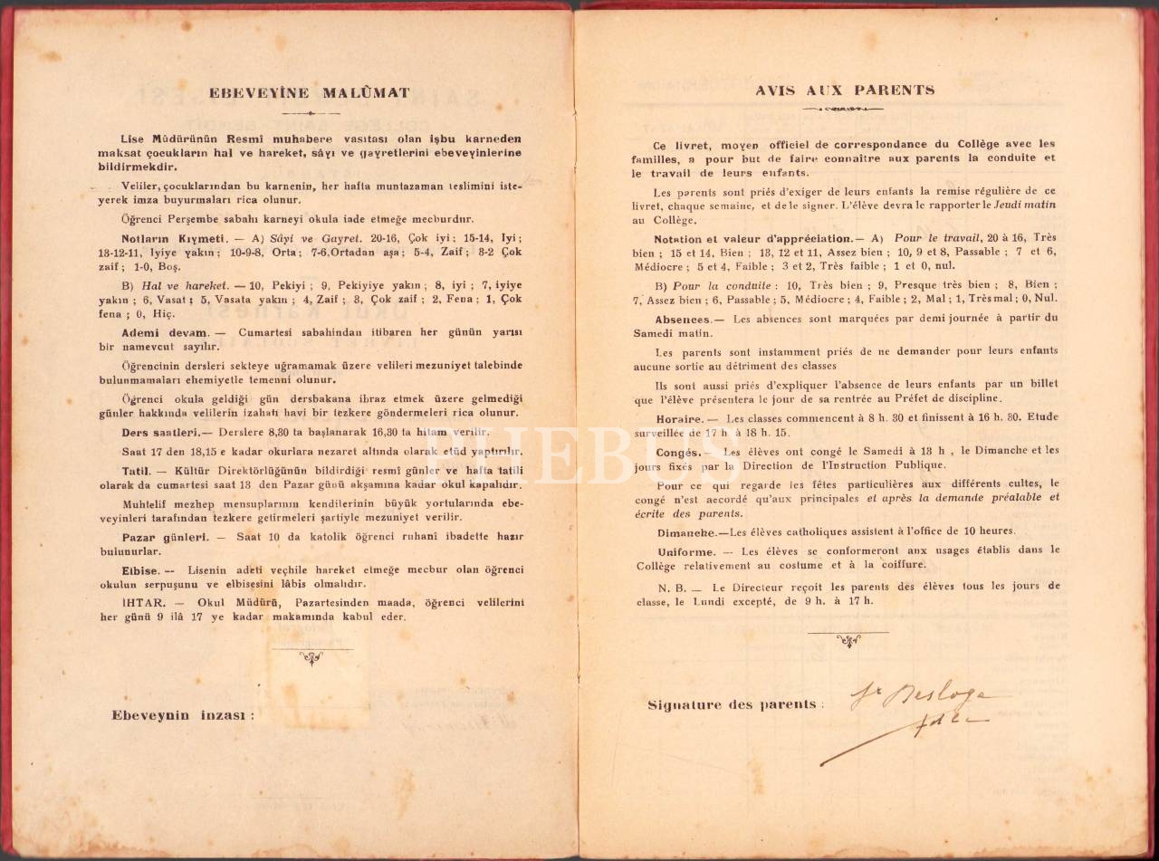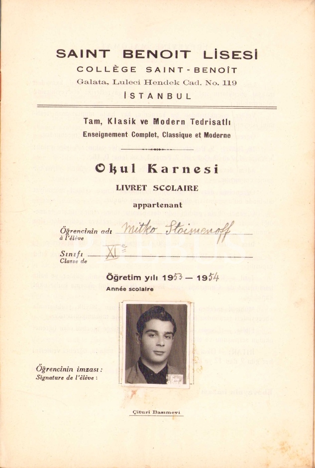 Saint Benoit Lisesi'ne ait üçü fotoğraflı olmak üzere dört adet okul karnesi, 1948-55 yılları, 15x23 cm, kapakları hafif yıpranmış haliyle