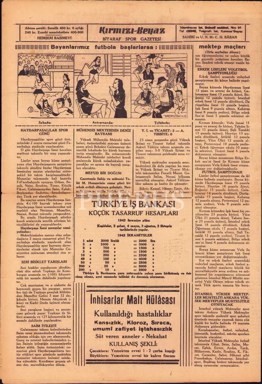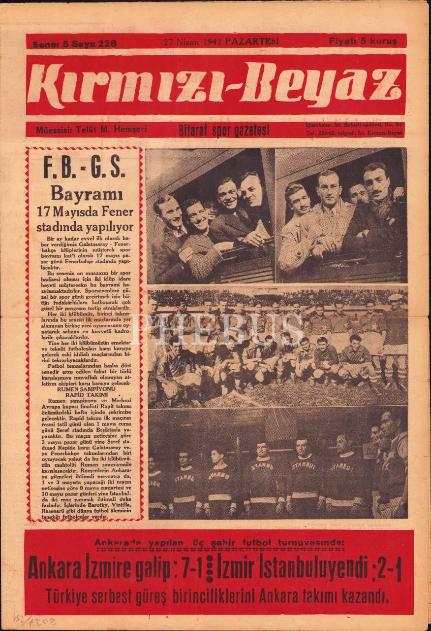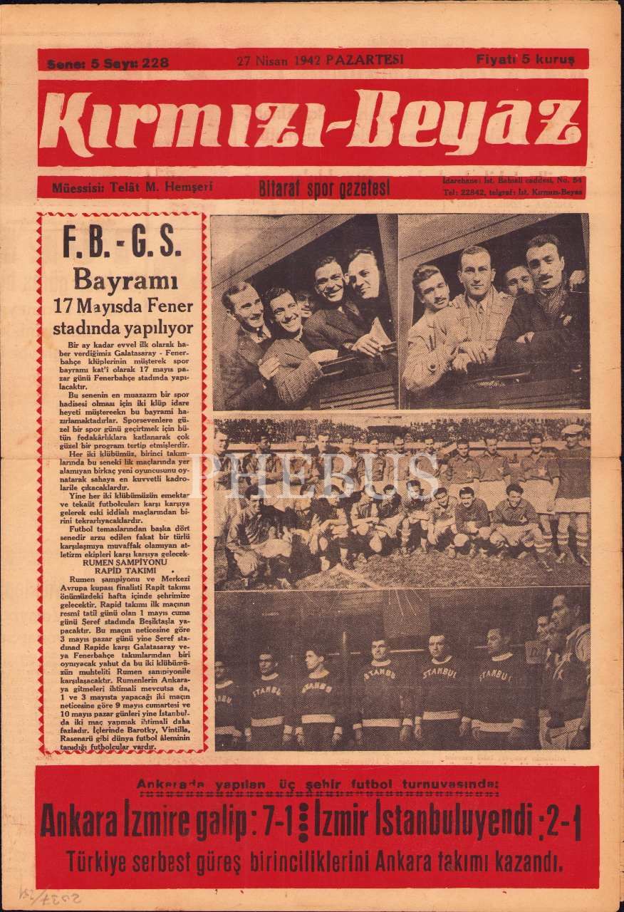 Kırmızı-Beyaz spor gazetesi, 27 Nisan 1942, 28x41 cm, kenarları yıpranmış haliyle