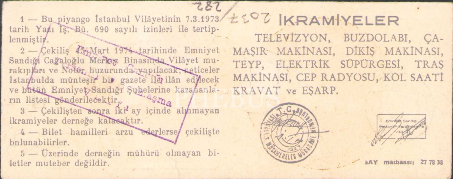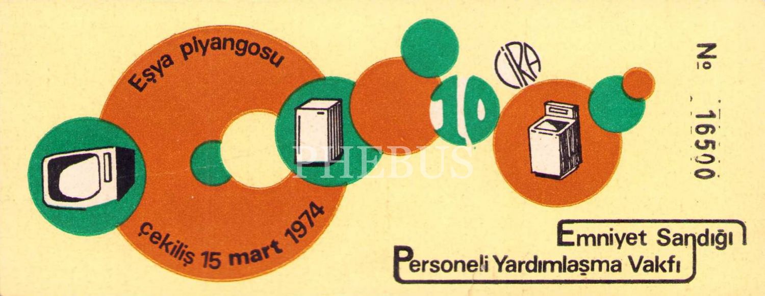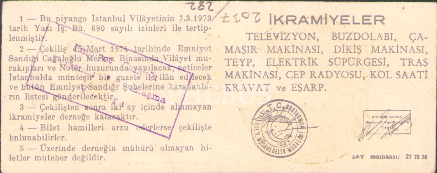 Emniyet Sandığı Personeli Yardımlaşma Vakfı eşya piyangosu, 15 Mart 1974, 6x15 cm, ufak bir yırtık mevcut haliyle