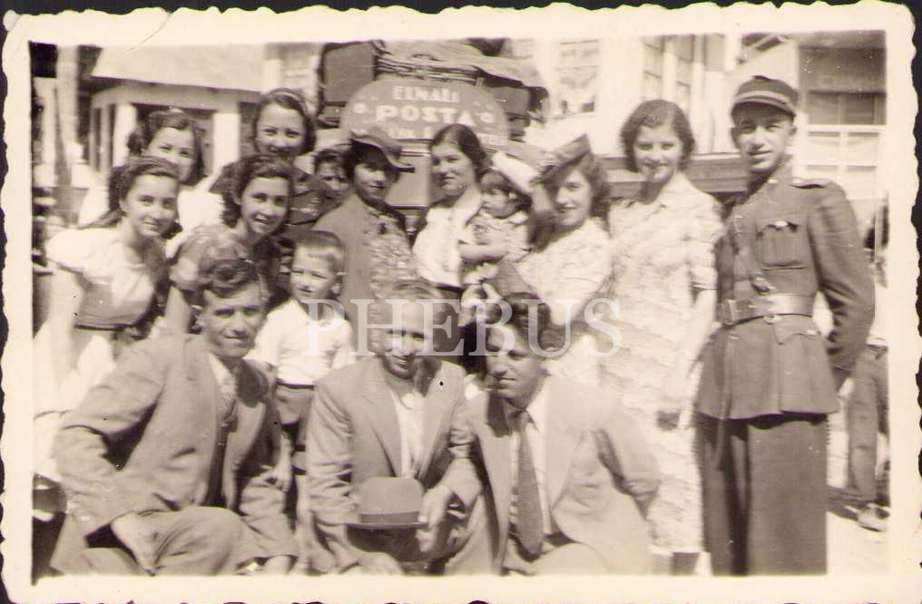 "Elmalı Posta" tabelasının görüldüğü topluluk hatıra fotoğrafı, 5x8 cm, üst köşesi yırtık haliyle
