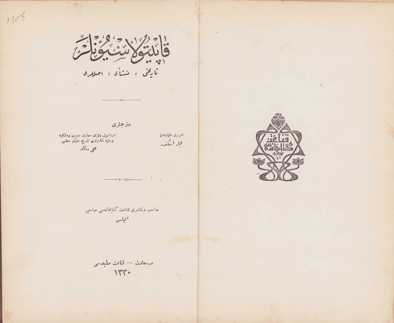 Kapitülasyonlar - Tarihi, menşei, Usulleri çev., Macar İskender - Ali Reşad, Kanaat Matbaası, 1330, Osmanlıca, cilt sırt yarısı kopuk, 351 sayfa, 16x23cm, ÖZEGE; 10133