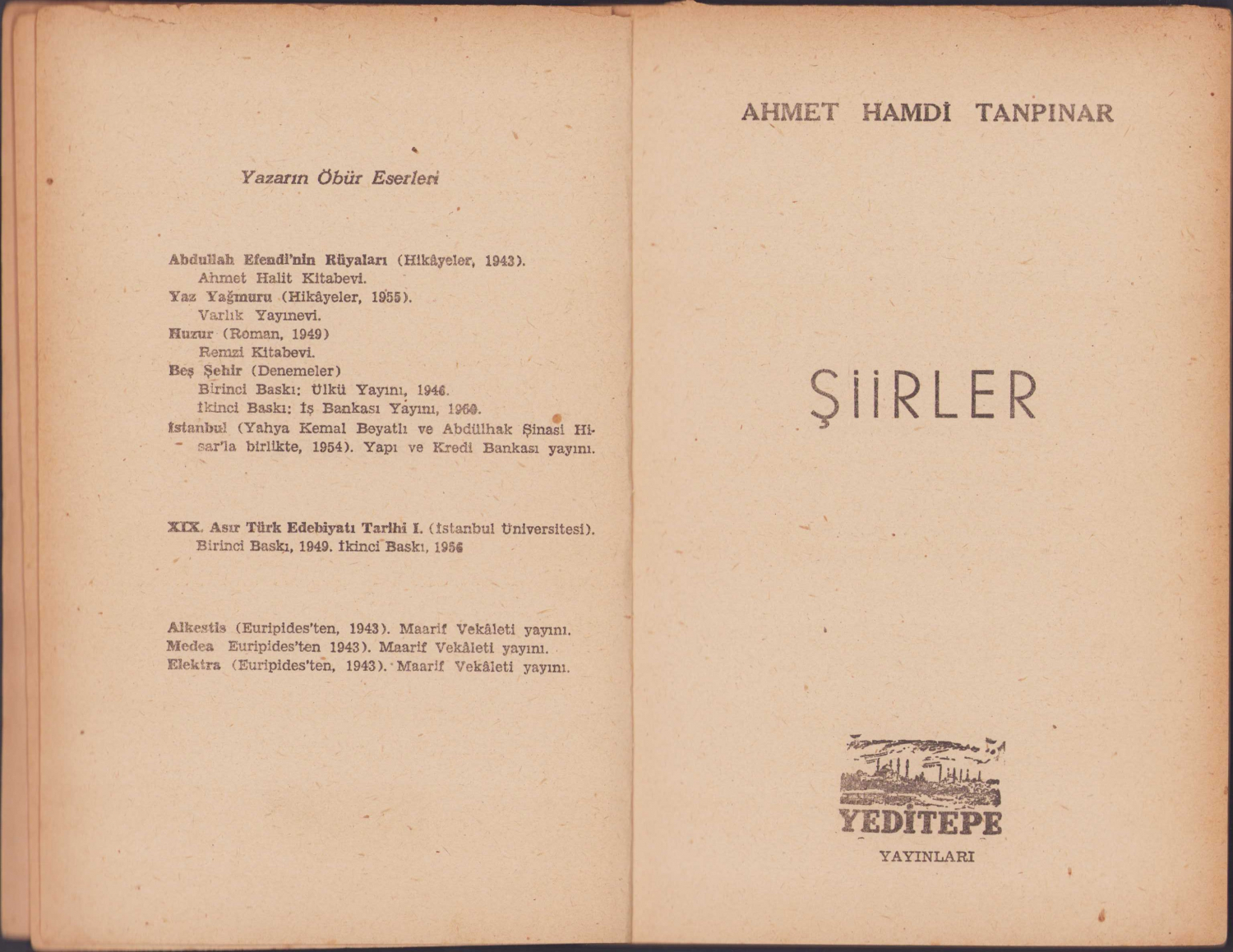 Ahmet Hamdi Tanpınar, ilk baskı Şiirler, Yeditepe yayınları, İstanbul 1961 tarihli, 75 sayfa, 15x21 cm