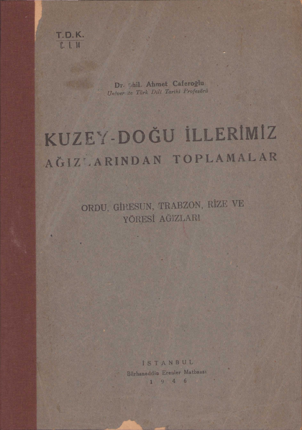 Kuzey - Doğu İllerimiz Ağızlarından Toplamalar, Dr. Phil. Ahmet Caferoğlu, İstanbul, 1946, ön kapak bir kenar yırtık, 351 sayfa, 16x22cm