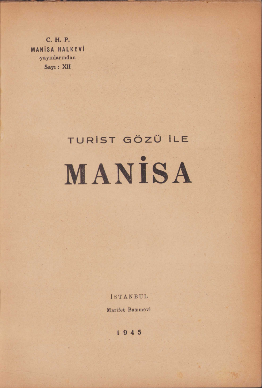Turist Gözü İle Manisa, CHP Manisa Halkevi yayınları, sayı XII, İstanbul Marifet Basımevi, 1945 tarihli, resimli ve haritalı, 50 sayfa, 18x26 cm