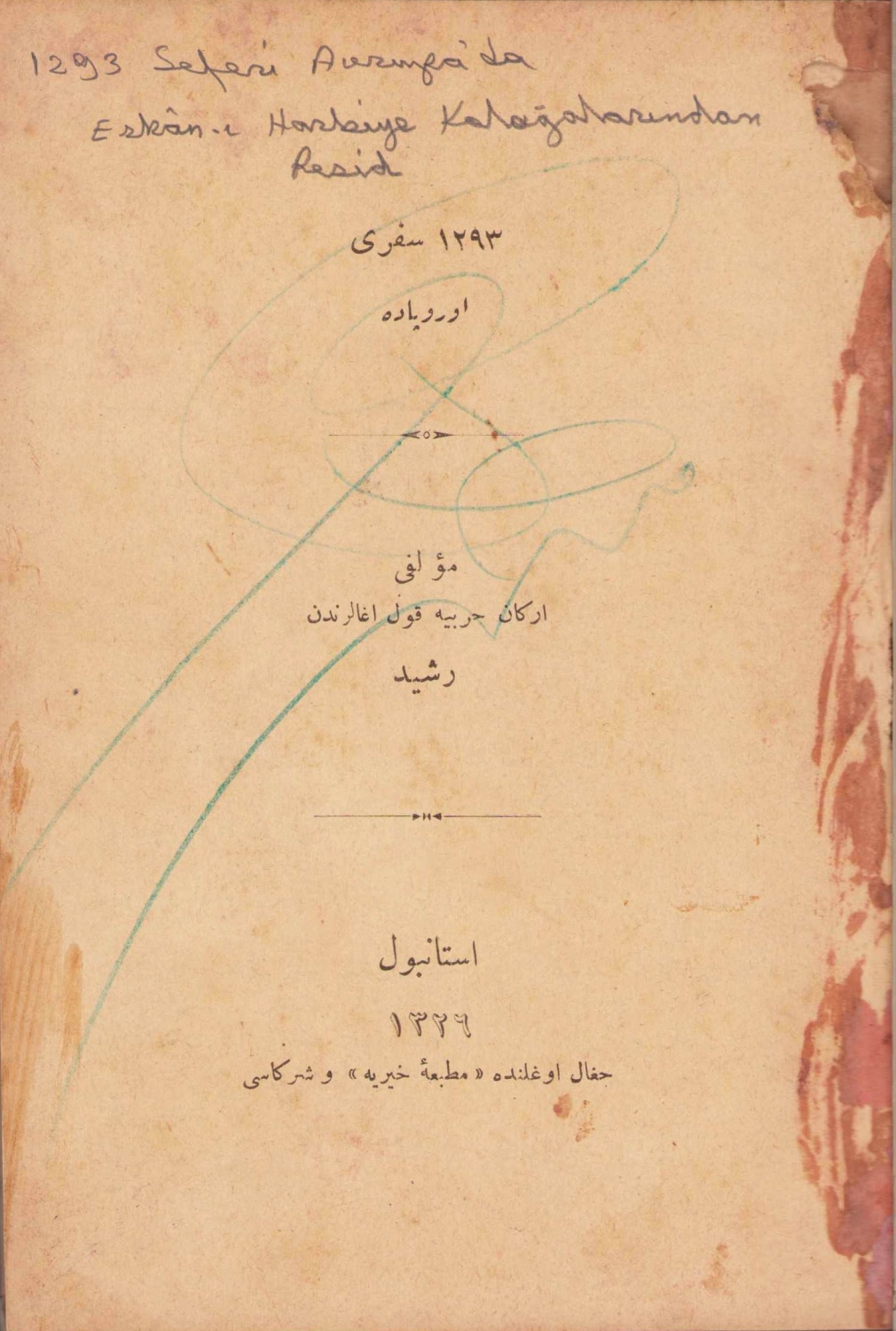 1293 Seferi Avrupa'da, (Erkanı Harbiye Kulaoğullarından) Reşid, İstanbul, 1326 tarihli, Osmanlıca, arka kapak kırık, 88 sayfa, 13x19cm, ÖZEGE; 2099