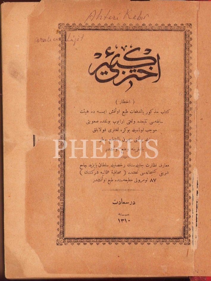 Osmanlıca Ahterî-i Kebîr, Dersaadet [İstanbul] 1310, 1198 s., 14x20 cm, tuğralı cildinde, cildi yorgun ve birkaç sayfası yıpranmış haliyle