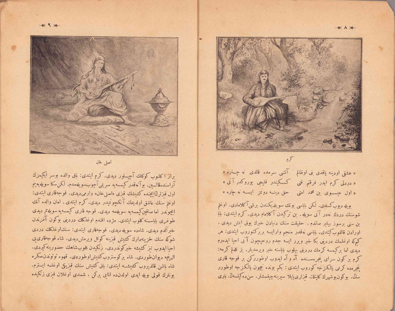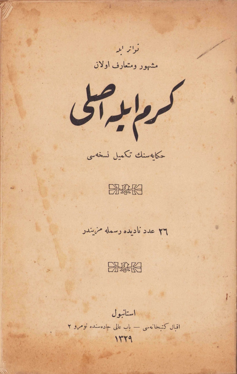Kerem ile Aslı - hikayesinin tekmil nüshası, İstanbul - İkbal Kütüphanesi, 1329, Osmanlıca, yeni cildinde, resimli, 140 sayfa, 16x25cm