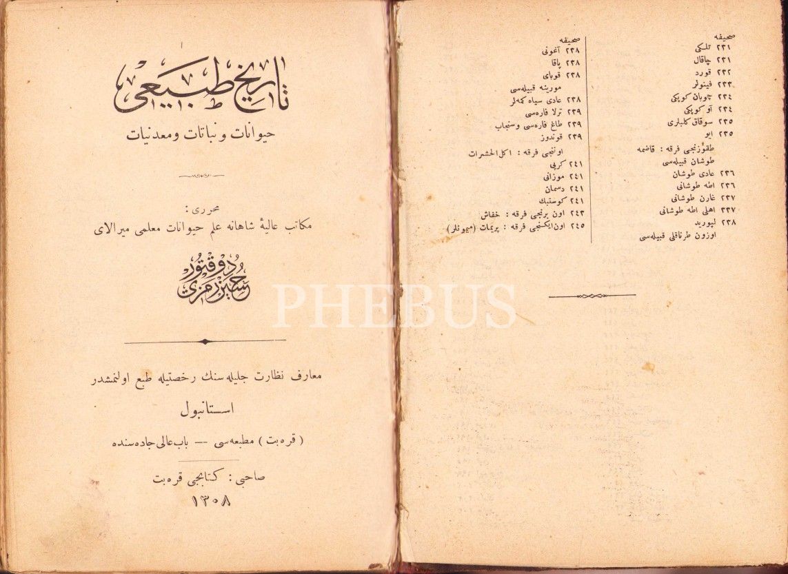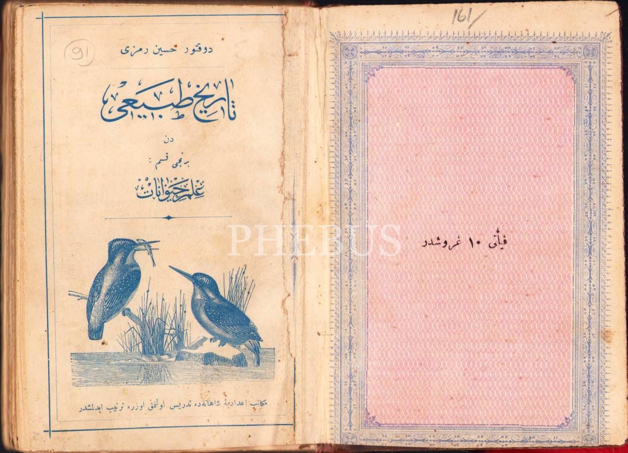 Osmanlıca Târîh-i Tabîî - Hayvanât ve Nebâtât ve Madeniyyât, Hüseyin Remzi, Karabet Matbaası, İstanbul 1308, 248 s., 12x17 cm, cildi yıpranmış haliyle
