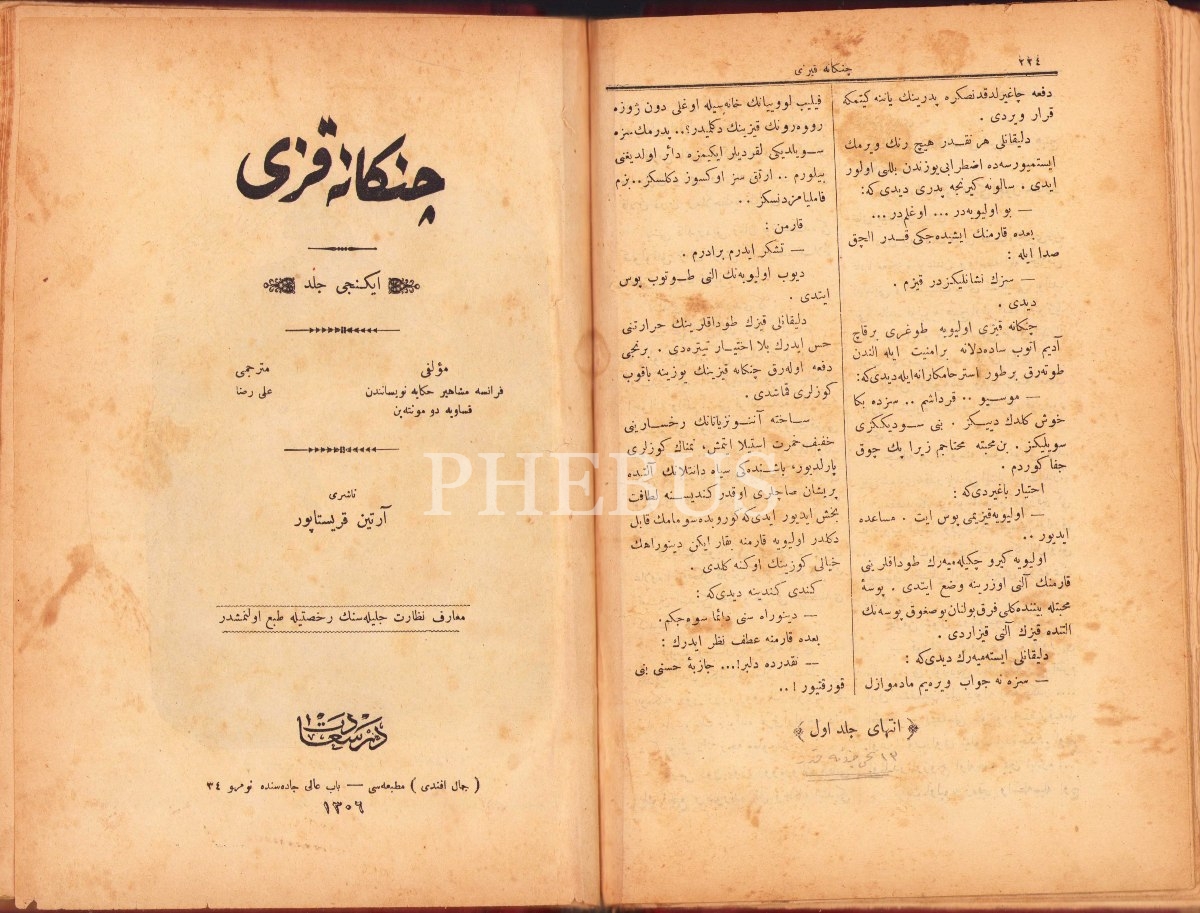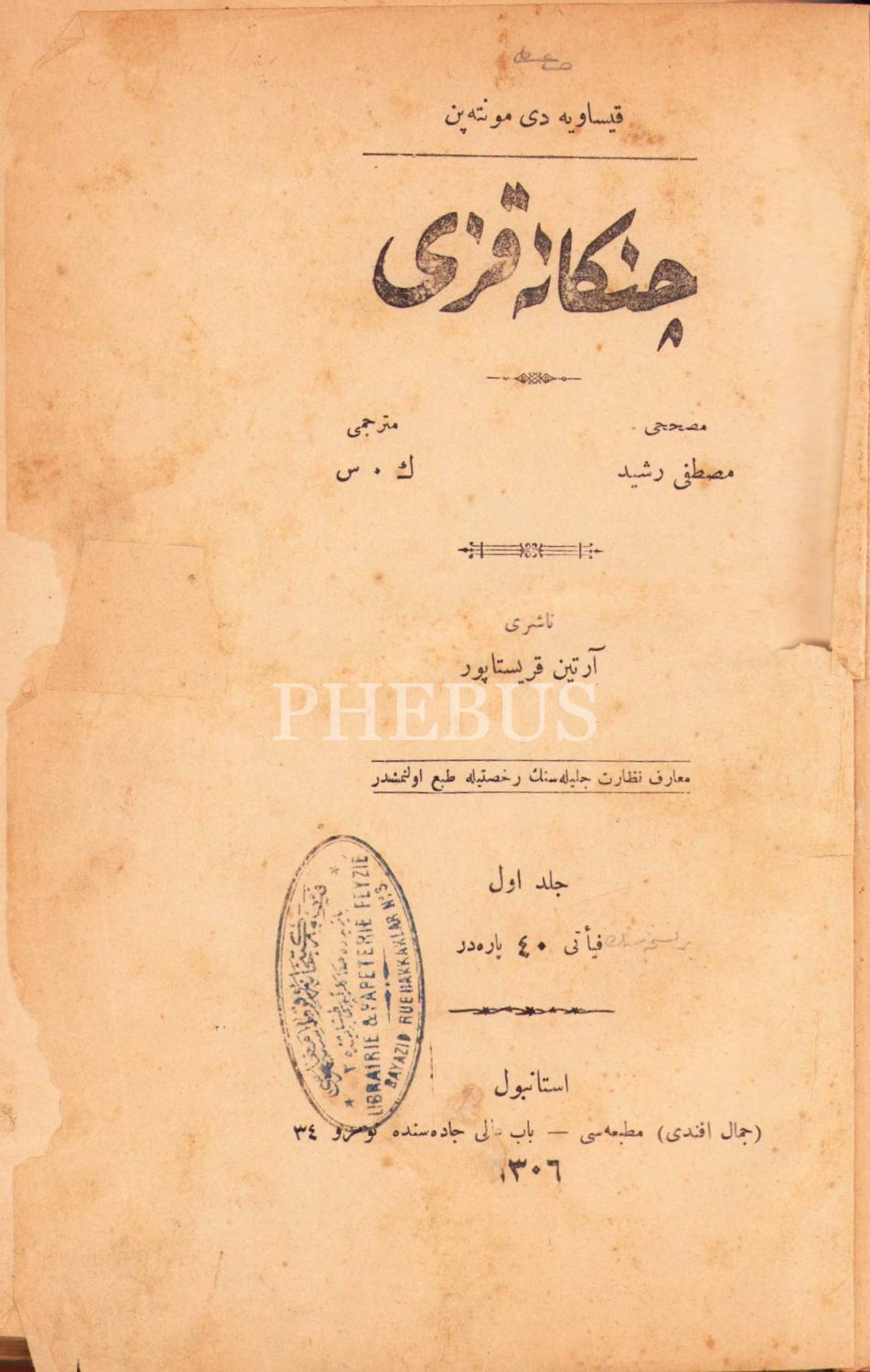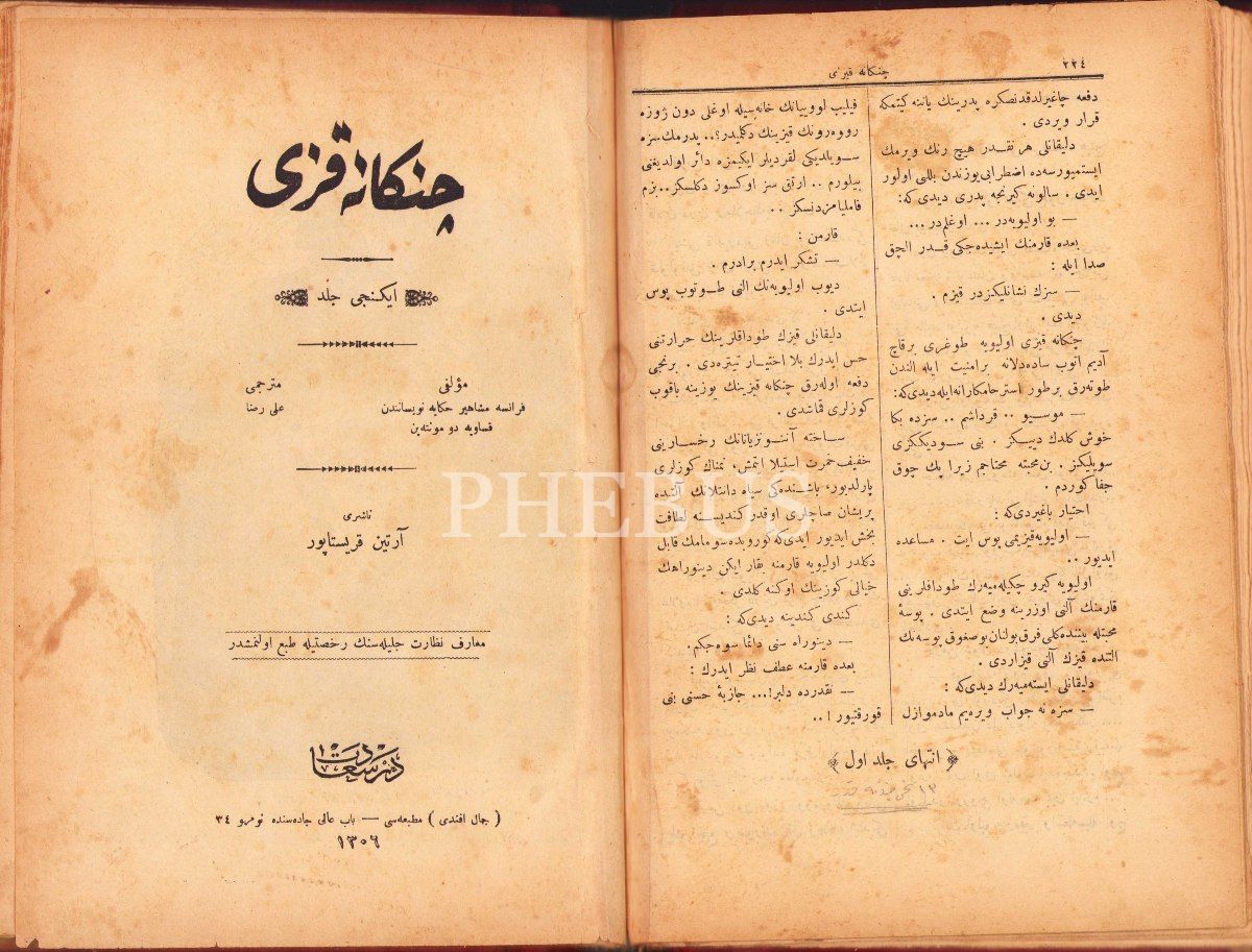 Tuğralı ve armalı cildinde Osmanlıca Çingene Kızı-2 Cild, Xavier de Montepin, çev. K. S., Cemal Efendi Matbaası, İstanbul 1306, 224+202 s., 17x25 cm, yıpranmış haliyle