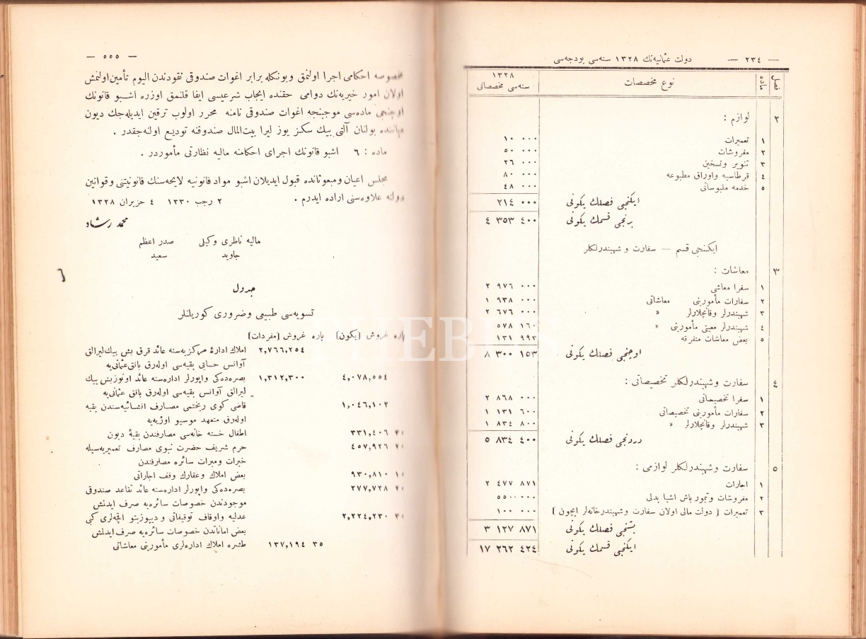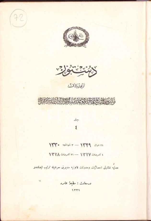 Sultan Reşad tuğralı Osmanlıca Düstûr-4. Cild (H. 1329-1330), Amire Matbaası, Dersaadet [İstanbul] 1331, 736 s. [235-267 arası eksik], 17x24 cm, cildi ve sırtı yıpranmış haliyle