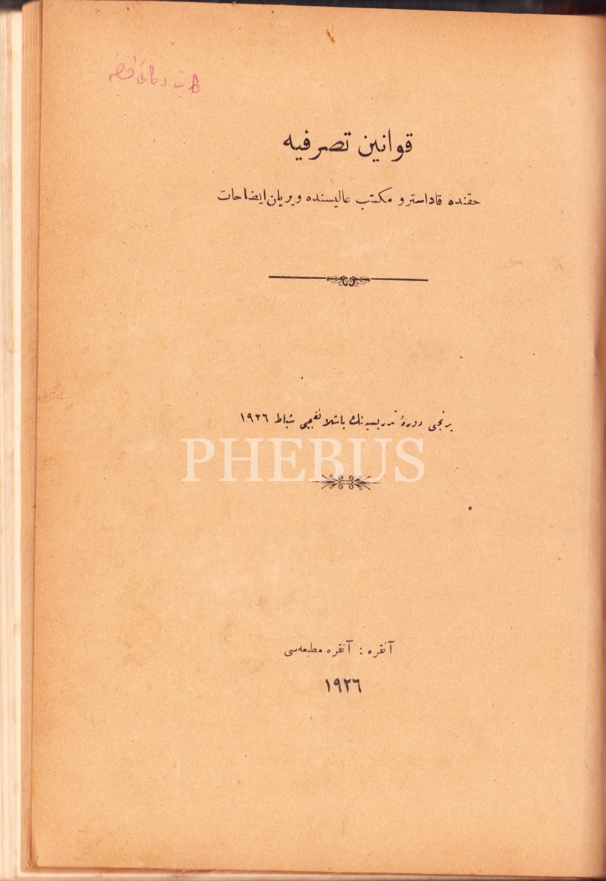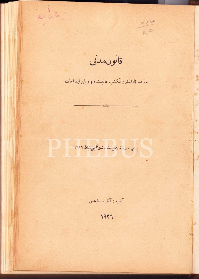Osmanlıca Kânûn-ı Medenî [Medeni Kanun] ve Kavânîn-i Tasarrufiyye [Tasarruf Kanunları], Ankara Matbaası, Ankara 1926, 214+132+135 s., 19x27 cm, cildi yıpranmış haliyle