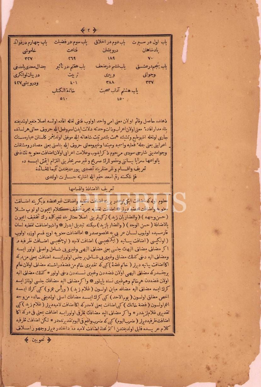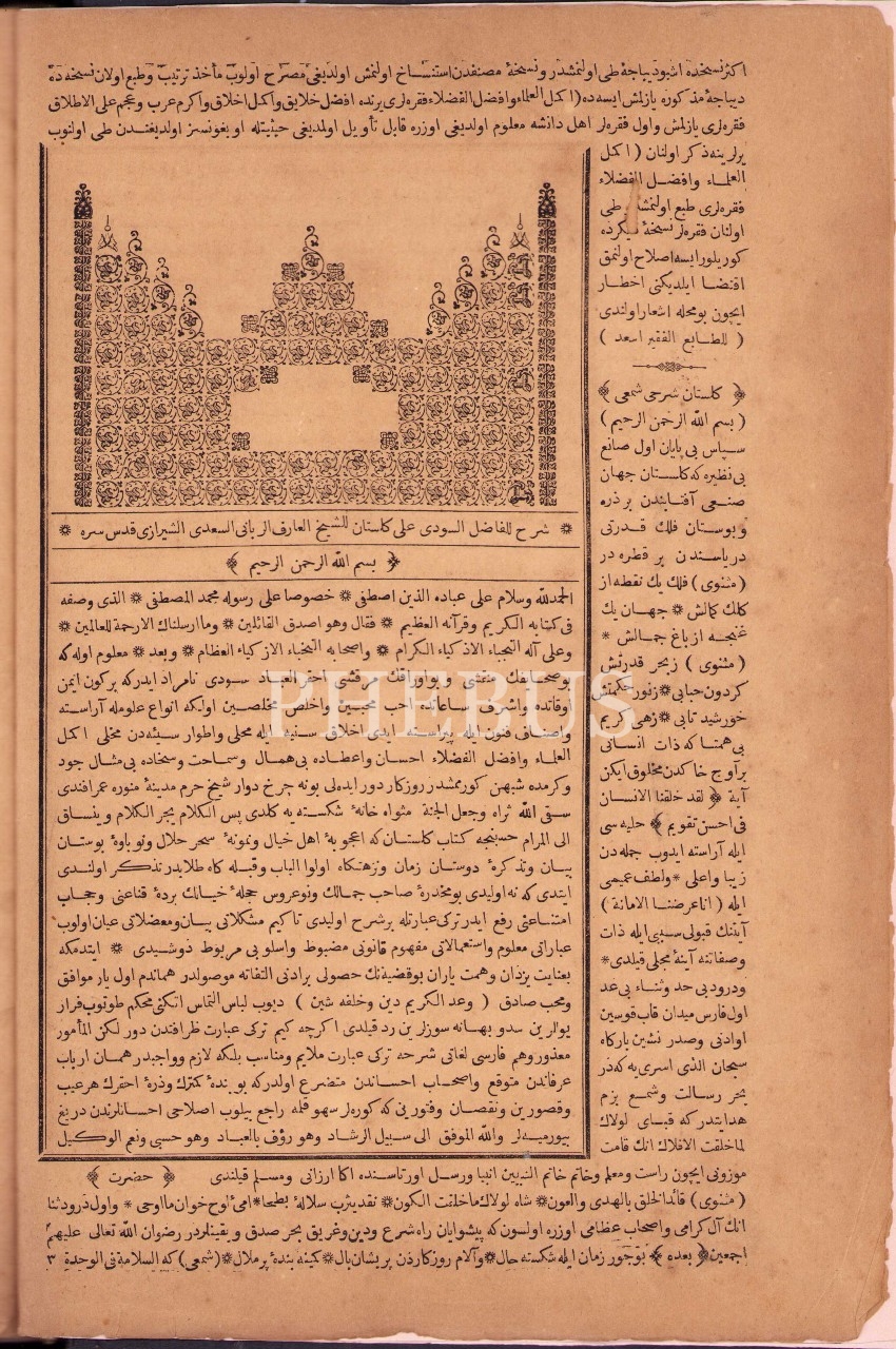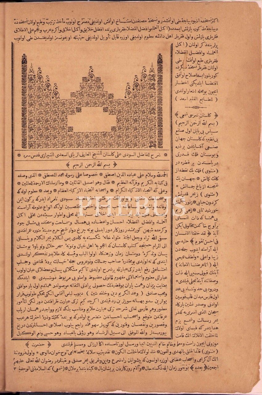 Osmanlıca Gülistân Şerhi, Sadi Şirazî, şerh eden: Sudi Bosnevi, Ali Bey Matbaası, İstanbul 1293, 512 s., 23x33 cm, bazı sayfa kenarları yıpranmış haliyle