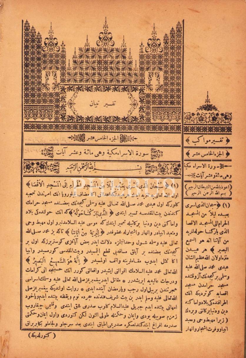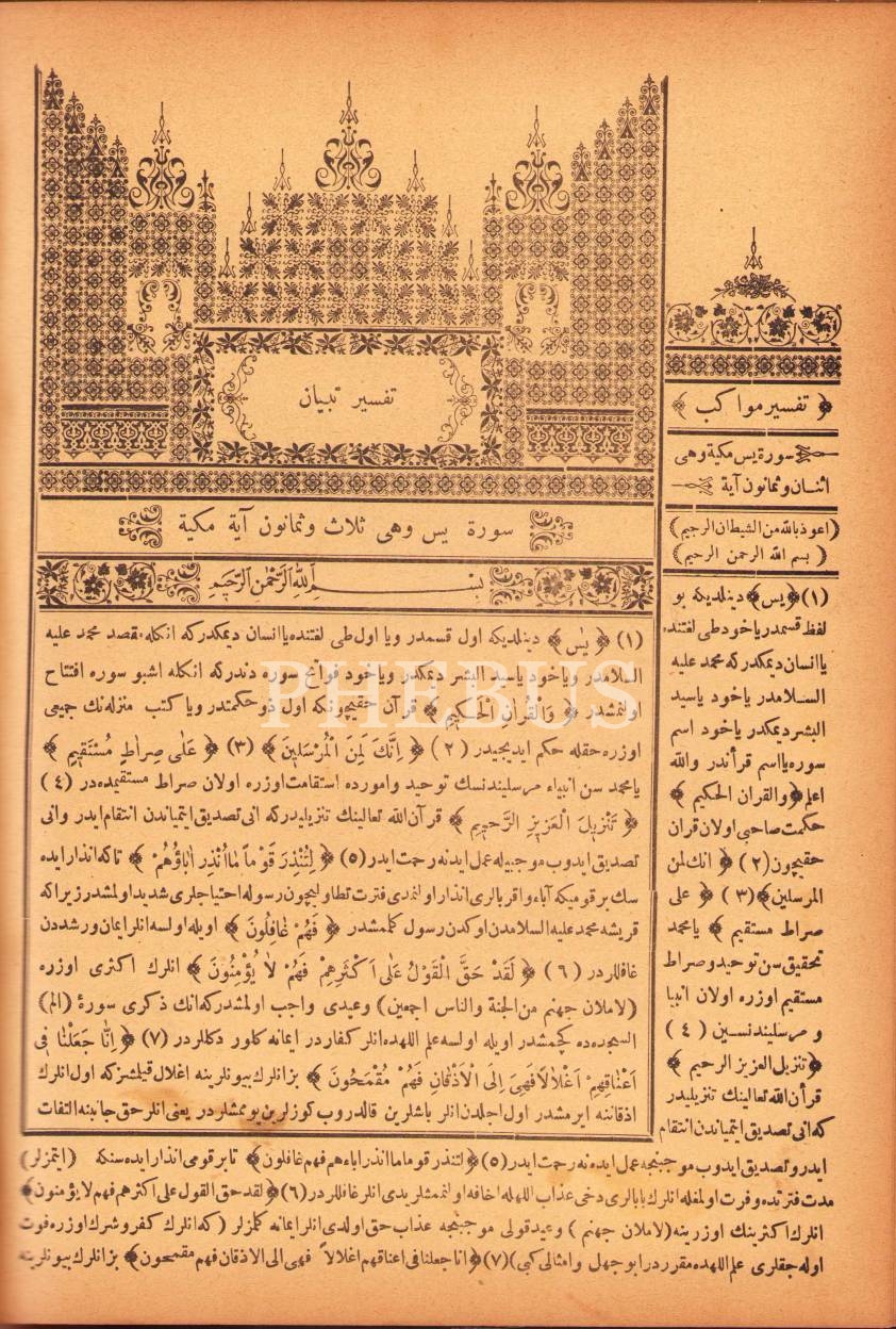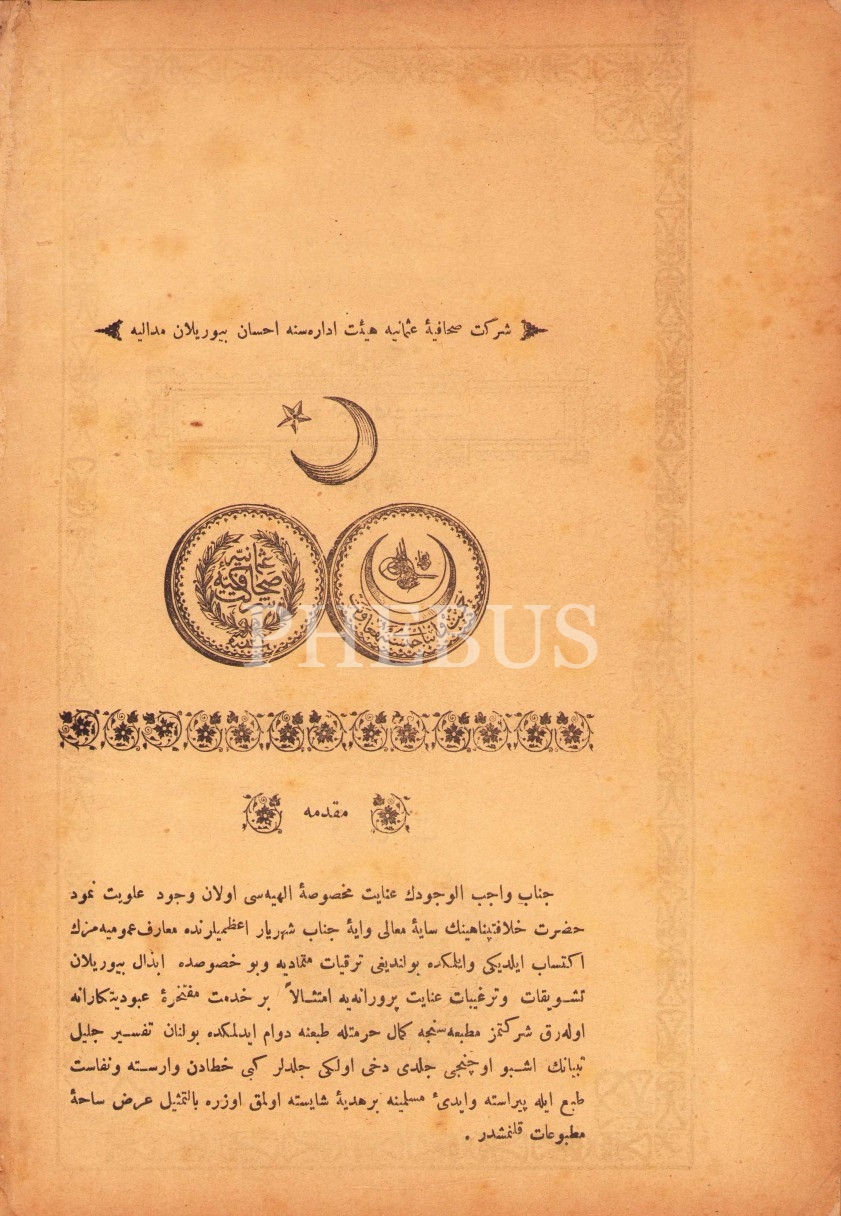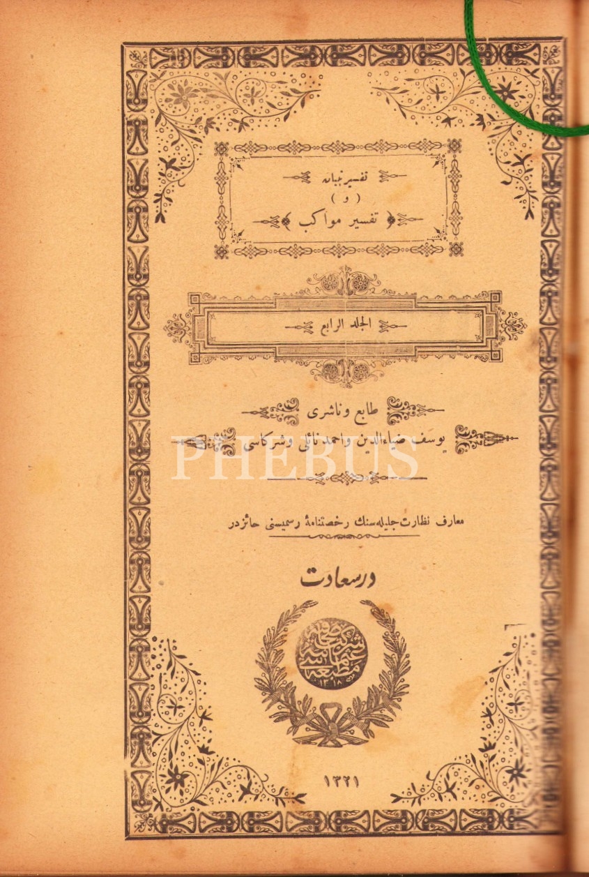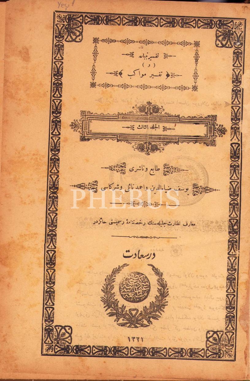 Osmanlıca Tefsîru Tibyân ve Tefsîru Mevâkib-3 ve 4. Cild, Şirket-i Sahafiye-i Osmaniye Matbaası, Dersaadet [İstanbul] 1321, 398+344 s., 21x28 cm, cildi yıpranmış ve sayfaları lekeli haliyle