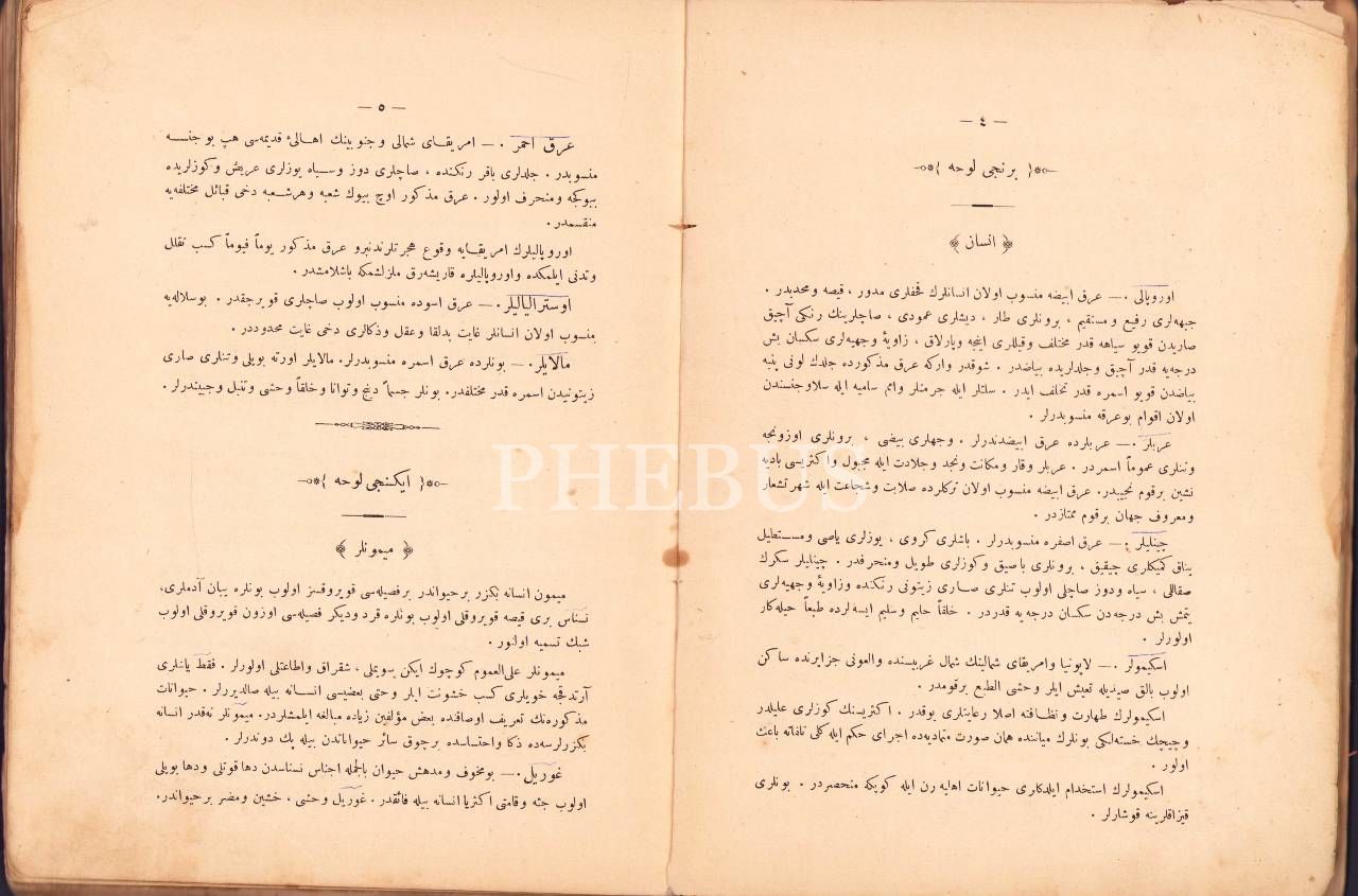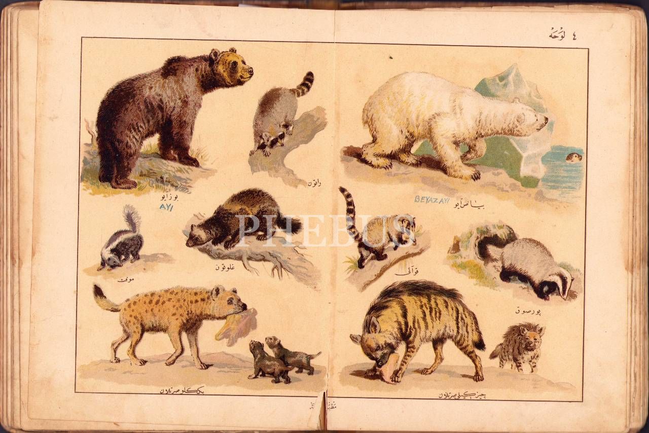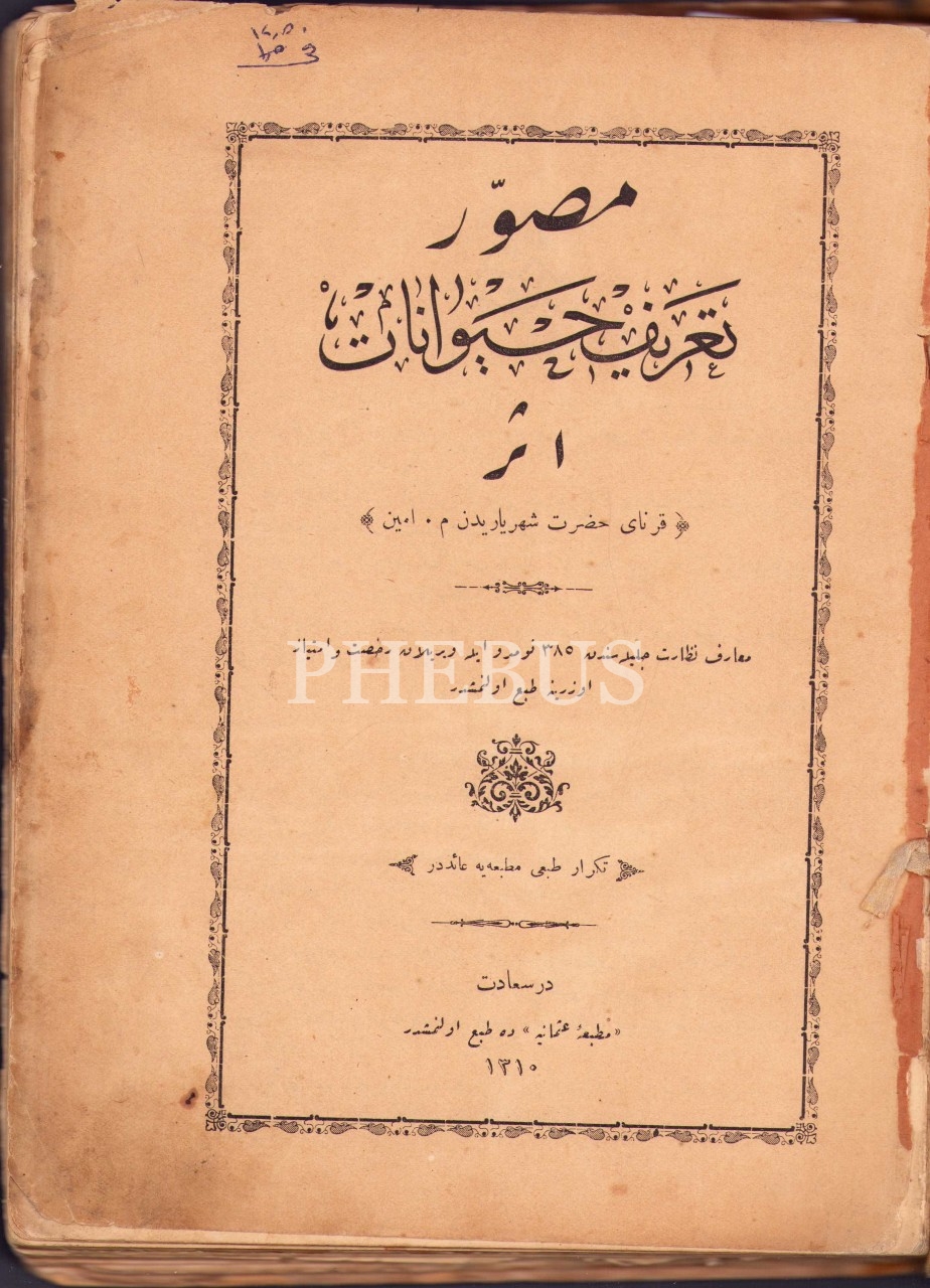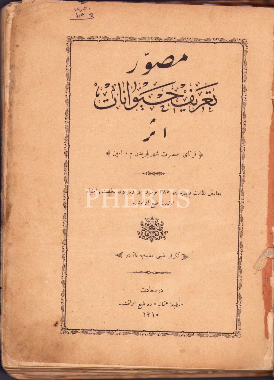 Osmanlıca Musavver Ta'rîf-i Hayvânât, M. Emin, Osmaniye Matbaası, Dersaadet [İstanbul] 1310, 71 sayfa metin, 19x26 cm, yıpranmış haliyle