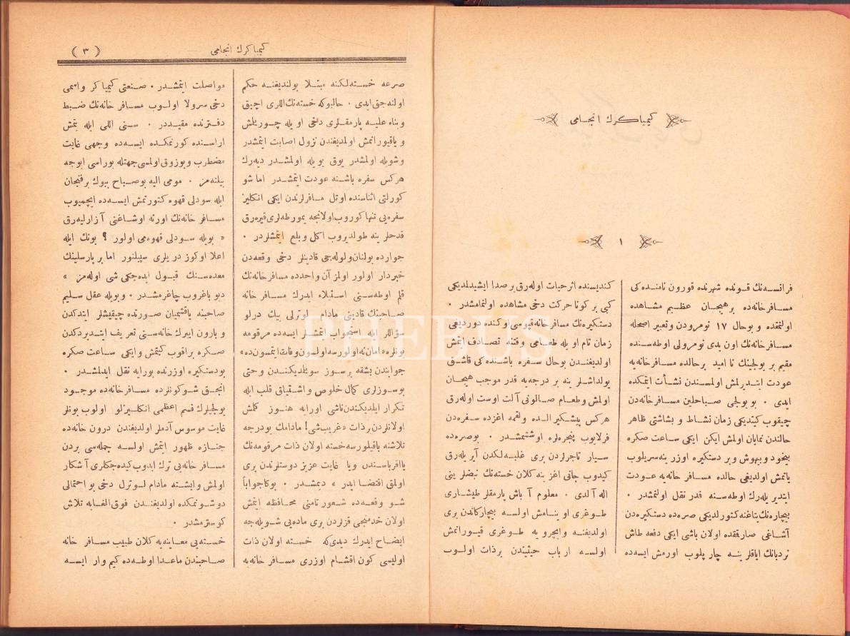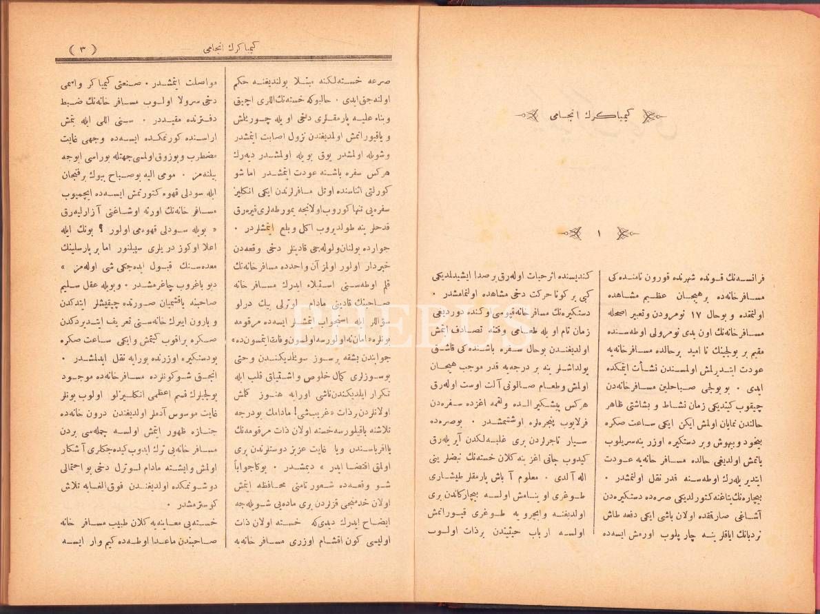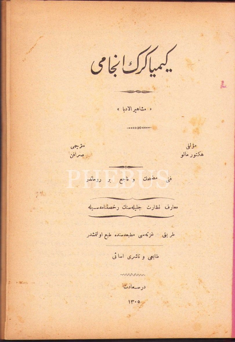 Osmanlıca Kimyagerin Encâmı, Hector Malot, çev. Sarafen [Lazyan], Tarik Gazetesi Matbaası, Dersaadet [İstanbul] 1305, 158 s., 18x25 cm, cildi yıpranmış haliyle