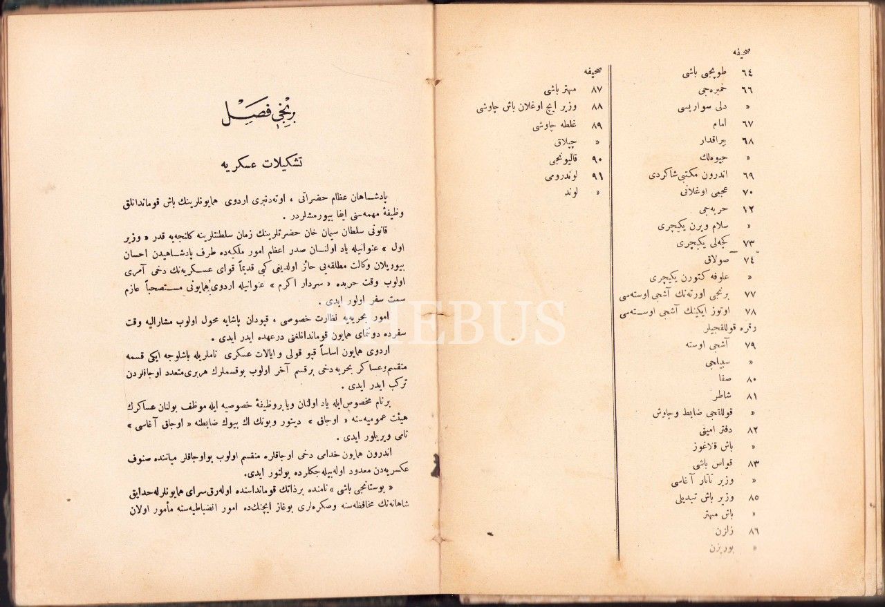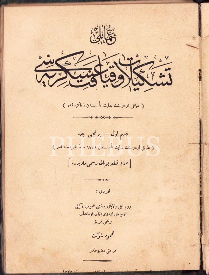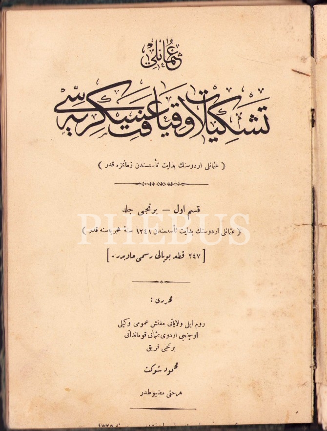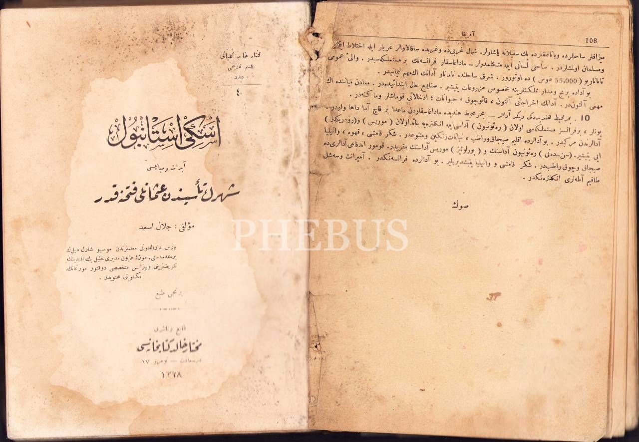 Eski İstanbul (Şehrin Tesisinden Osmanlı Fethine Kadar) [1. baskı], Celal Esad, Matbaa-i Hayriye ve Şürekası, İstanbul 1328, 250 s.; Osmanlı Teşkîlât ve Kıyâfet-i Askeriyyesi-1. Cild, Mahmud Şevket, 1325, 88 s. (sondan eksik), 18x25 cm, epey yıpranmış haliyle