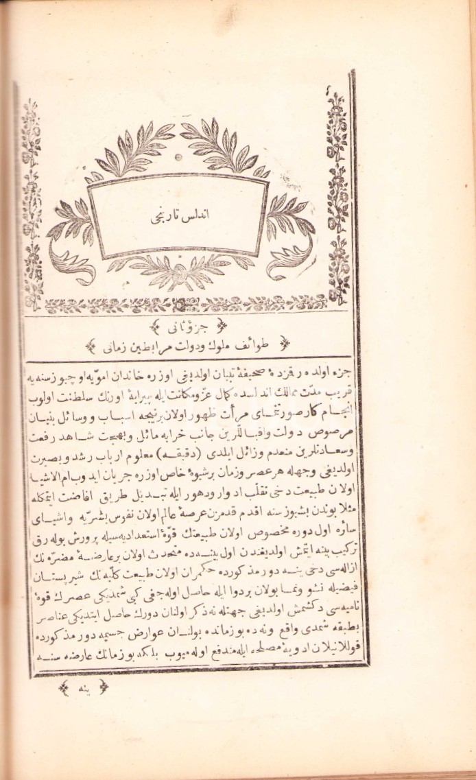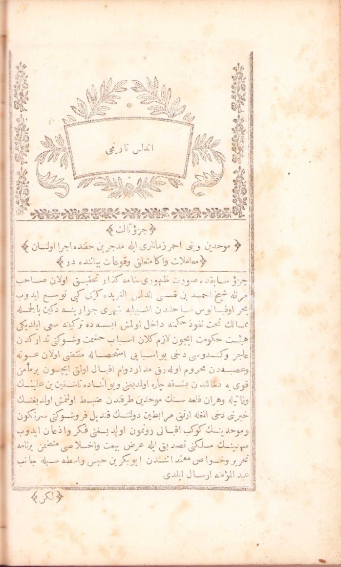 Osmanlıca Endülüs Târîhi-2 Cild, Takvimhane-i Amire ve Tercüman-ı Ahval Matbaaları, İstanbul 1276, 537 s., 16x25 cm, cildi yıpranmış ve sayfaları lekeli haliyle