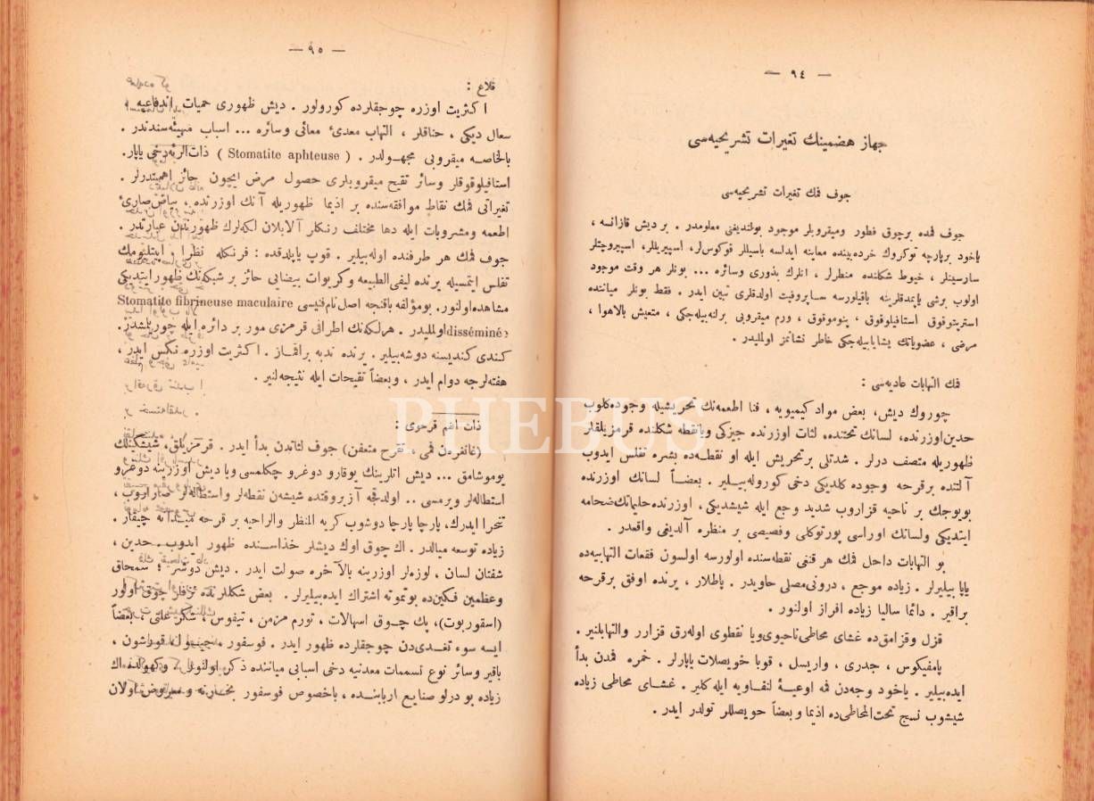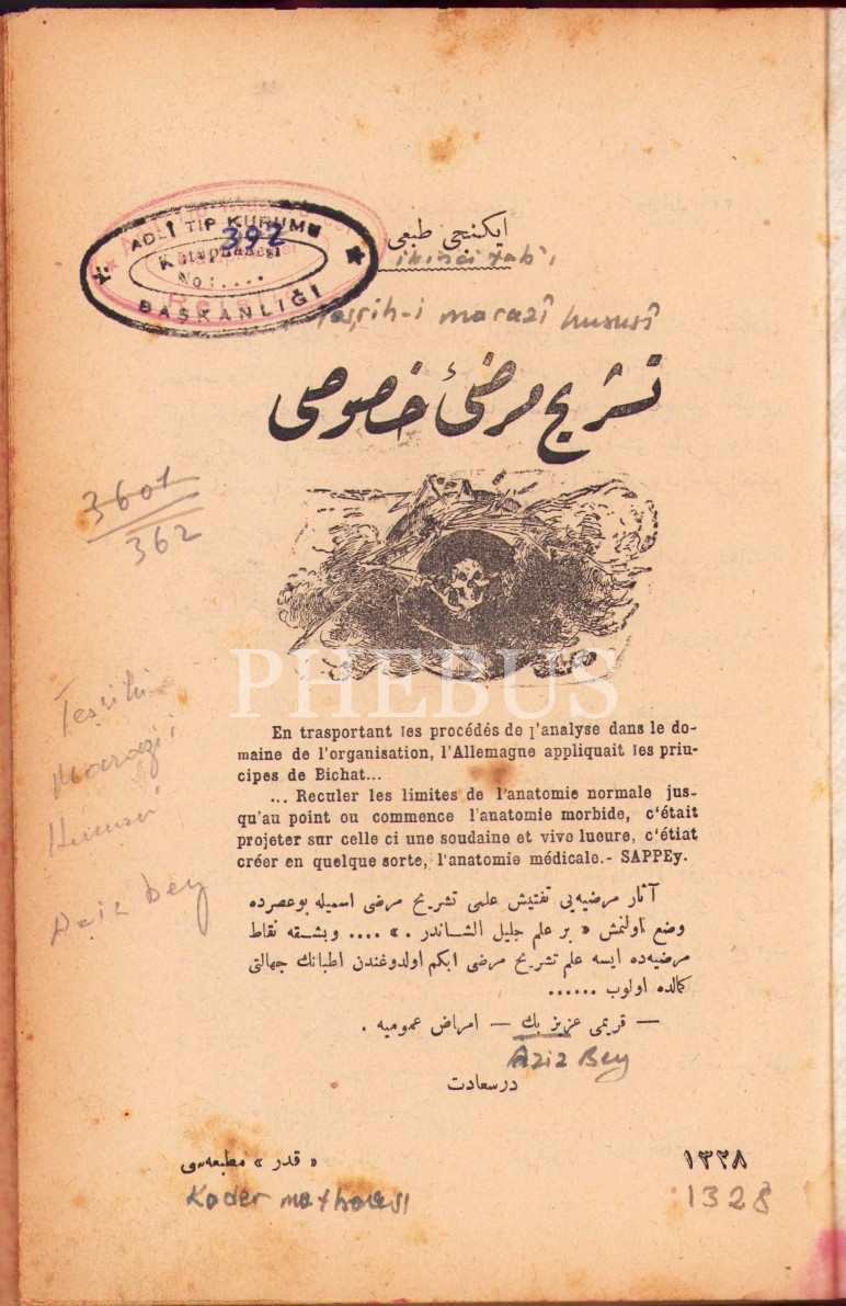 Osmanlıca Teşrîh-i Marazî-i Husûsî, Kırımlı Aziz Bey, Kader Matbaası, Dersaadet [İstanbul] 1328, 379 s., 16x24 cm, cildi hafif yıpranmış haliyle
