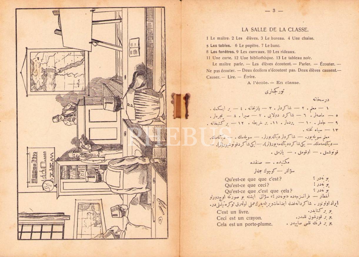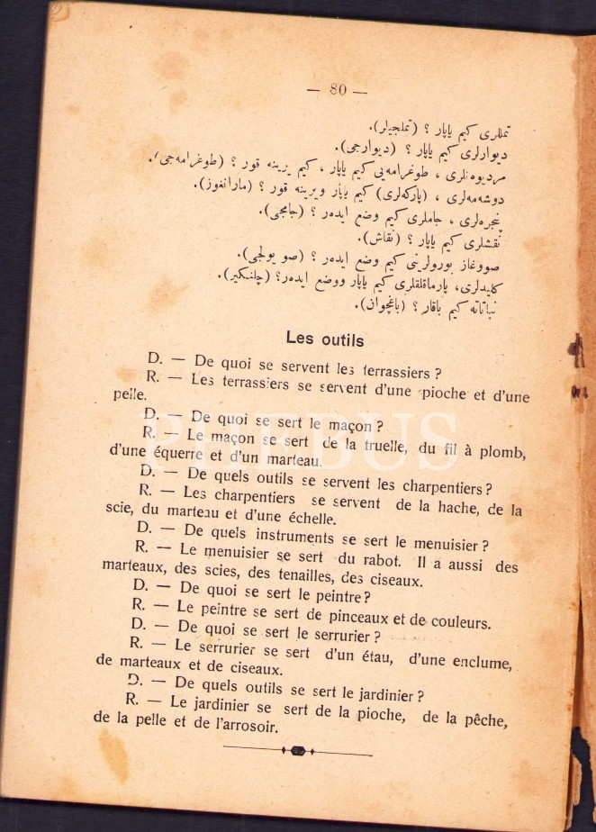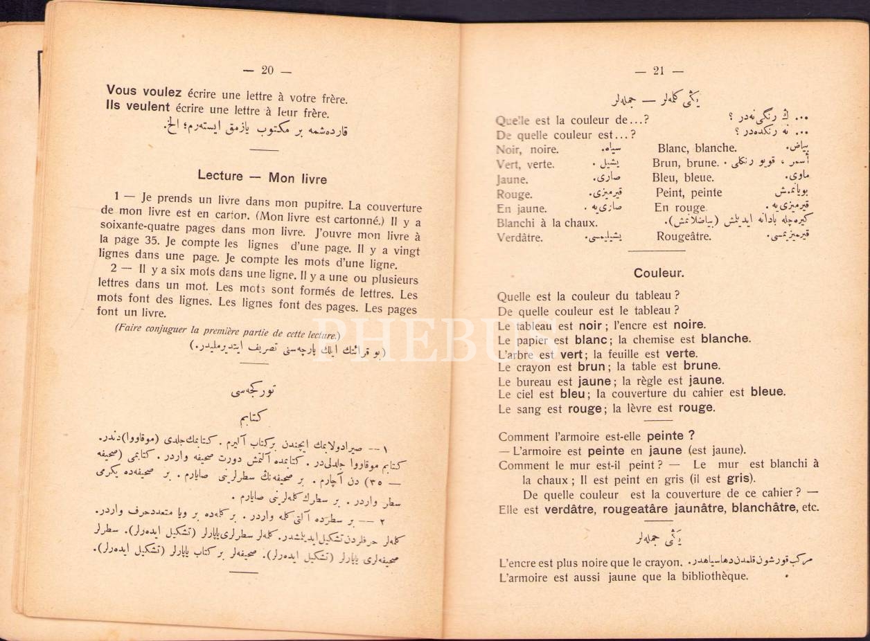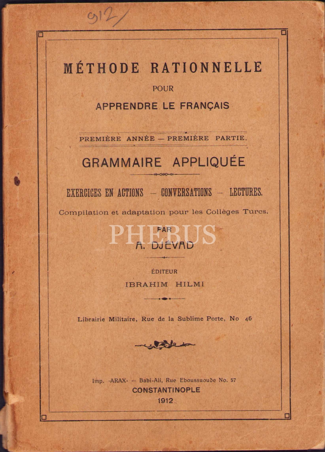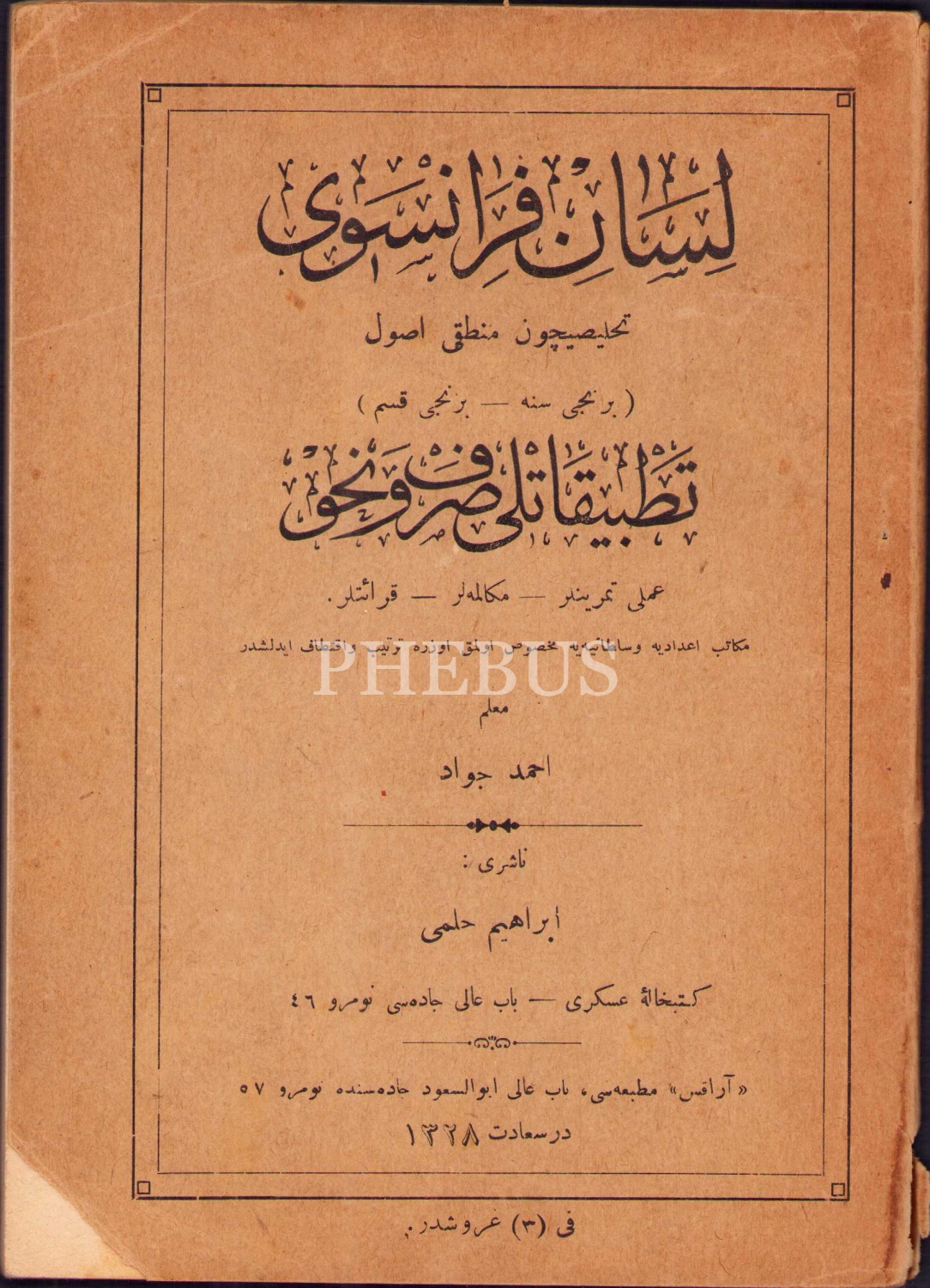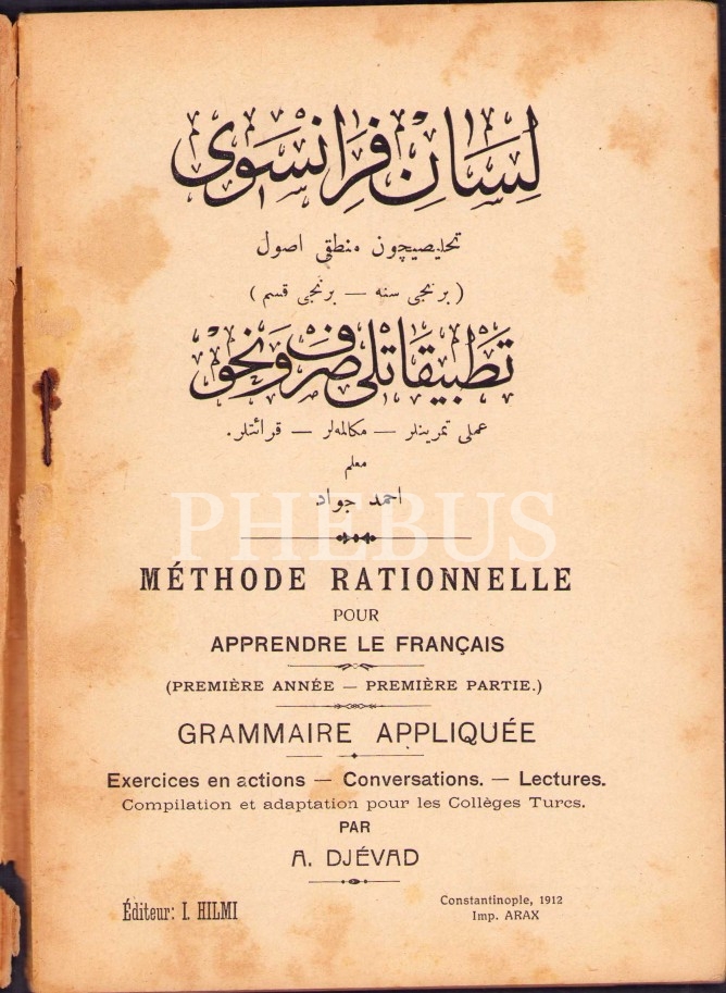 Osmanlıca-Fransızca Lisân-ı Fransevî-Tatbîkâtlı Sarf ve Nahiv, Muallim Ahmed Cevad, Araks Matbaası, Dersaadet [İstanbul] 1328, 80 s., 14x19 cm, kapak sayfası yıpranmış haliyle