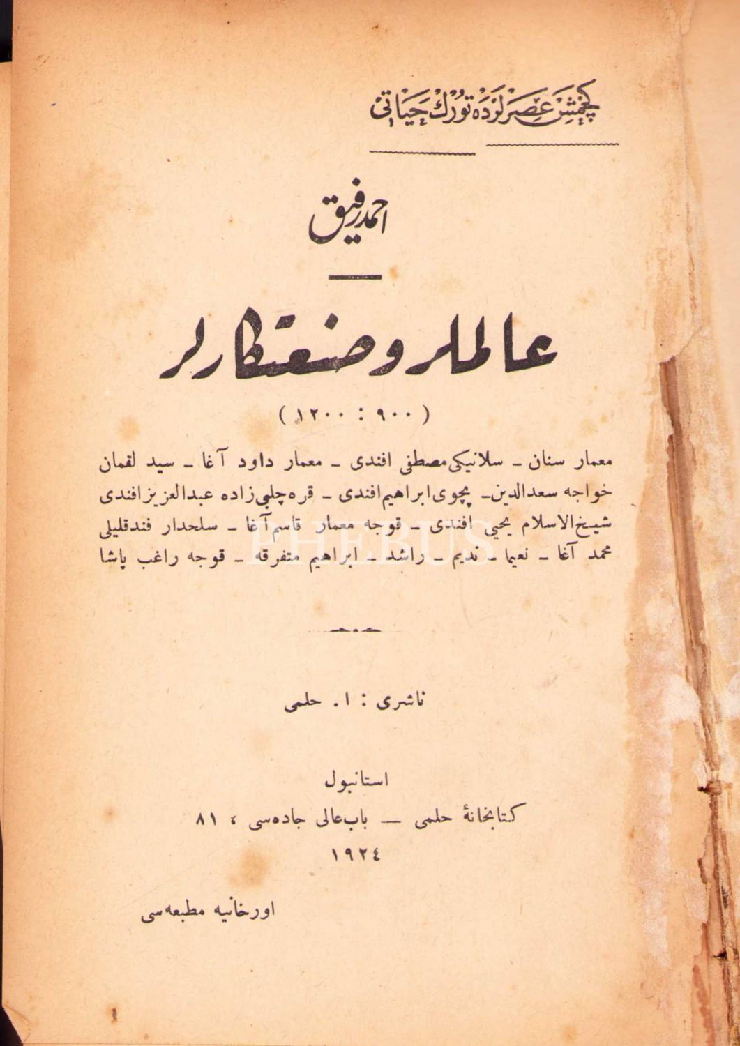 Osmanlıca Âlimler ve Sanatkârlar, Ahmed Refik, Orhaniye Matbaası, İstanbul 1924, 407 s., 12x18 cm, künye sayfası yıpranmış hafif yıpranmış haliyle