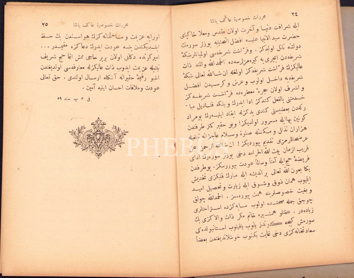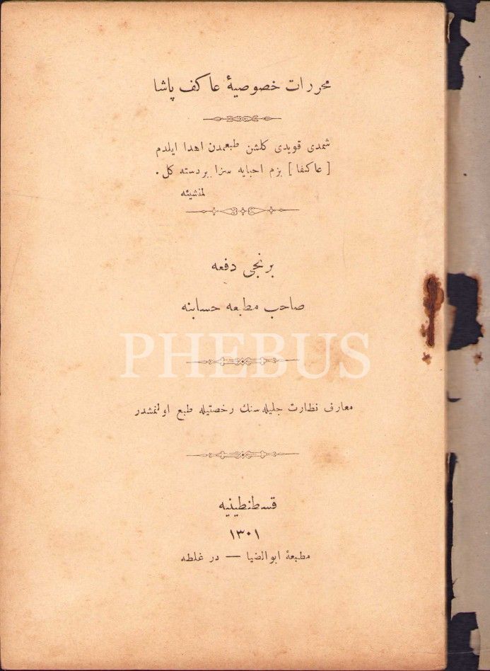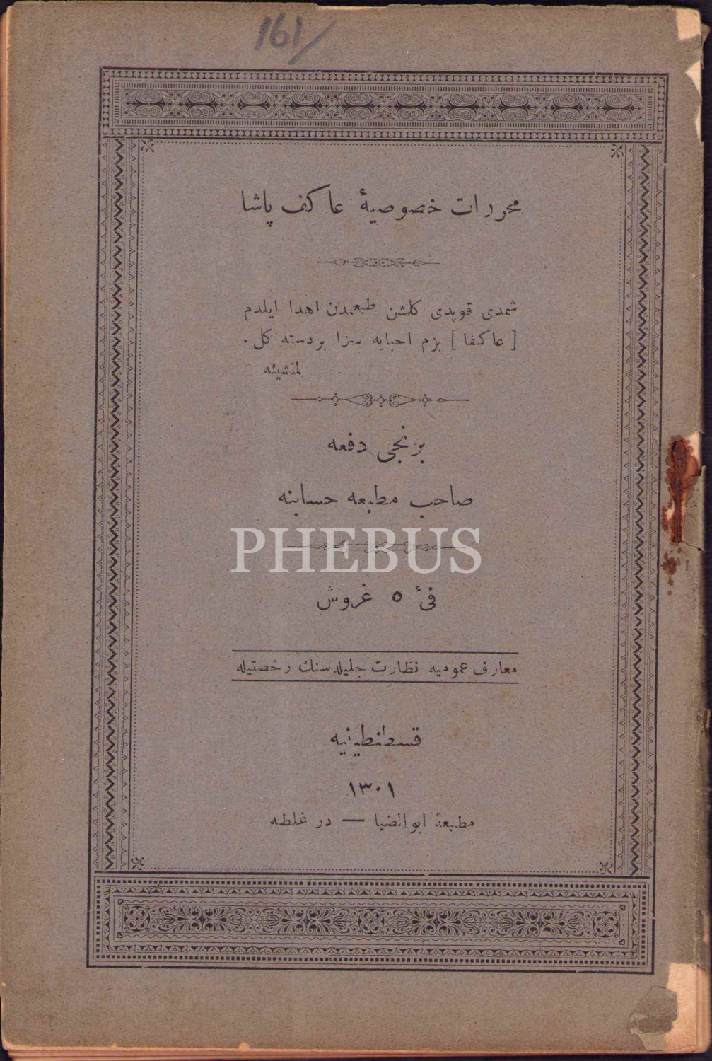 Osmanlıca Muharrerât-ı Husûsiyye-i Âkif Paşa [Özel Yazışmalar], Ebuzziya Matbaası, Kostantiniyye 1301, 80 s., 12x18 cm, sayfaları açılmamış ve kapağı yıpranmış haliyle