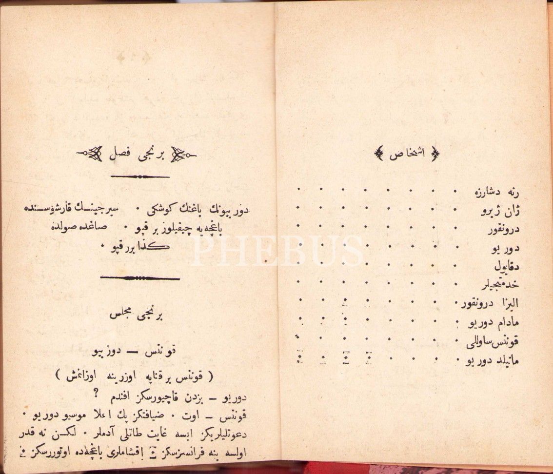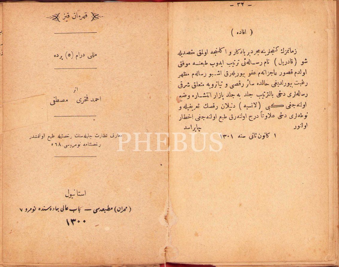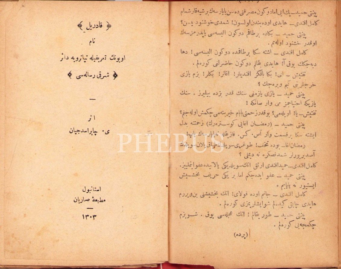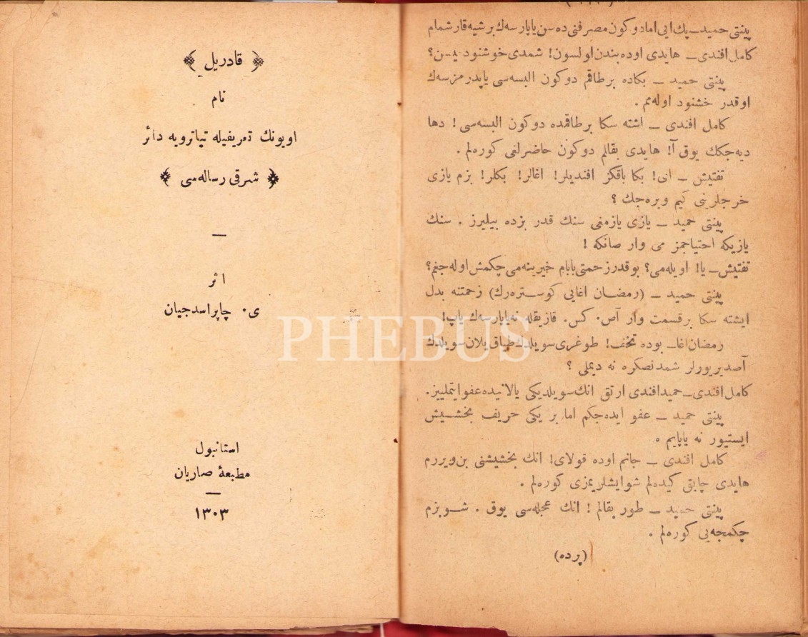 Kadril Nam Oyunun Tarifiyle Tiyatroya Dair 'Şarkı Risâlesi', Y. Çaprasciyan, Sarıyan Matbaası, İstanbul 1303, 32 s.; Kahraman Kız [Millî Drama], Ahmed Fahri-Mustafa, Mihran Matbaası, İstanbul 1300, 111 s.; Birinci Trajedi [künye sayfası eksik], Tasvir-i Efkar Matbaası, 1282, 55 s., 11x17 cm, cildi yıpranmış haliyle