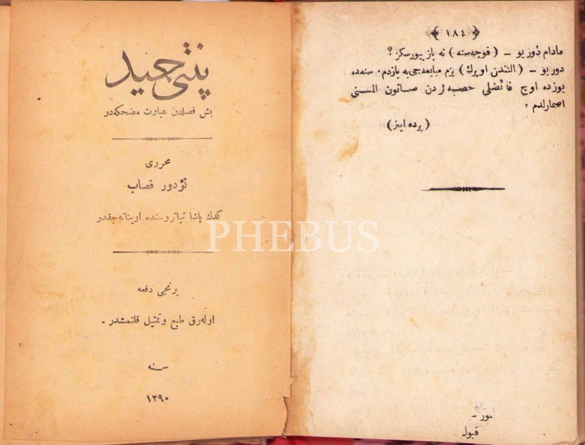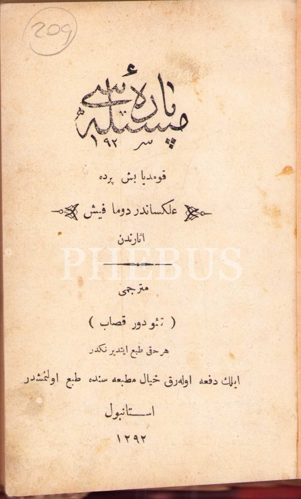 Osmanlıca 5 eser tek ciltte: Para Meselesi[1. baskı], Alexander Dumas Fils, çev. Teodor Kasap, Hayal Matbaası, İstanbul 1292, 184 s.; Pinti Hamid [1. baskı], Teodor Kasap, 1290, 112 s.;
