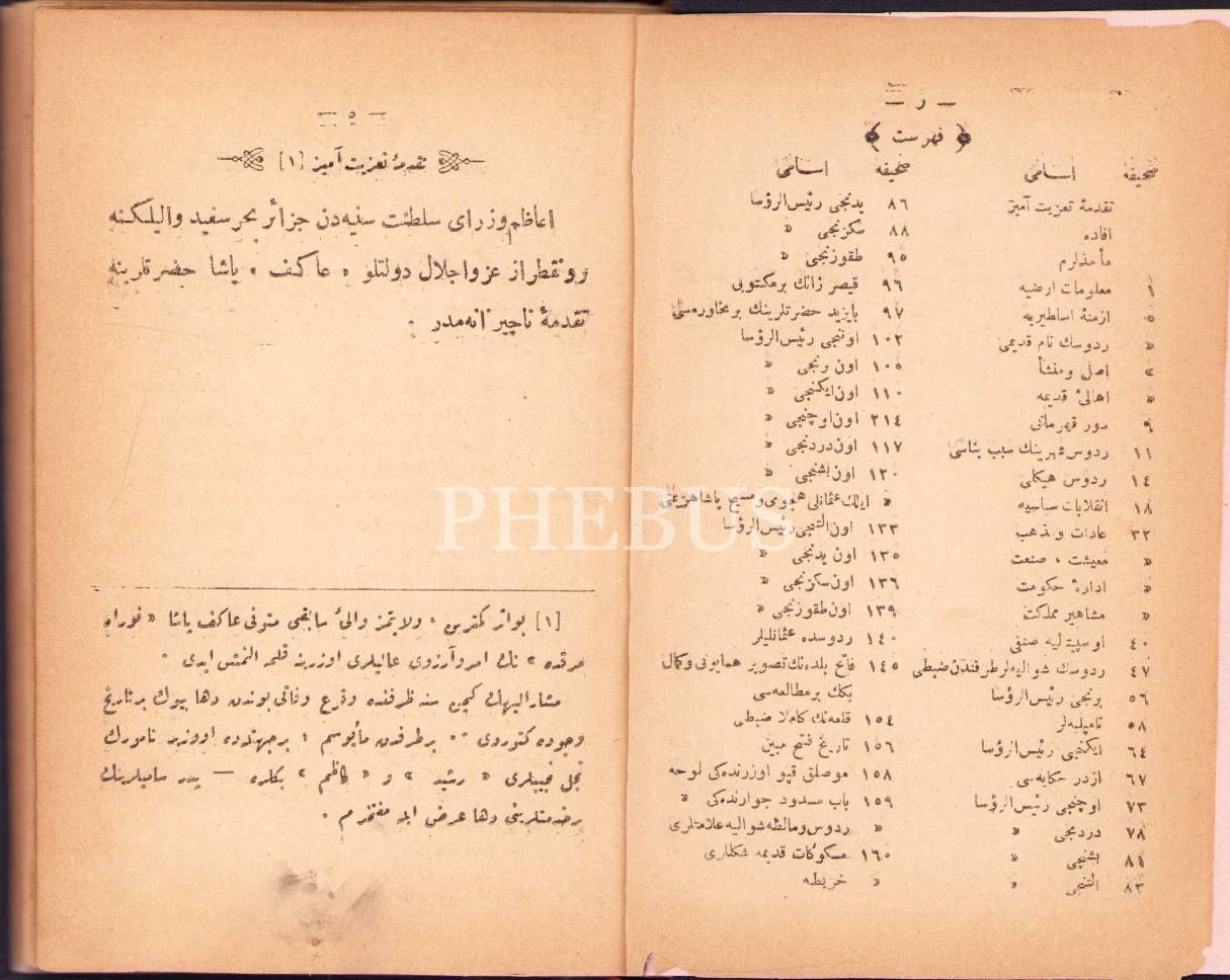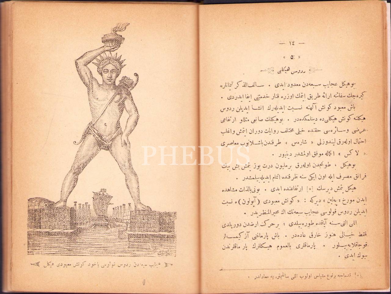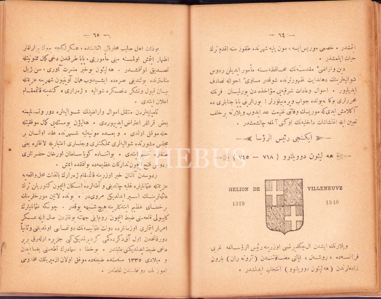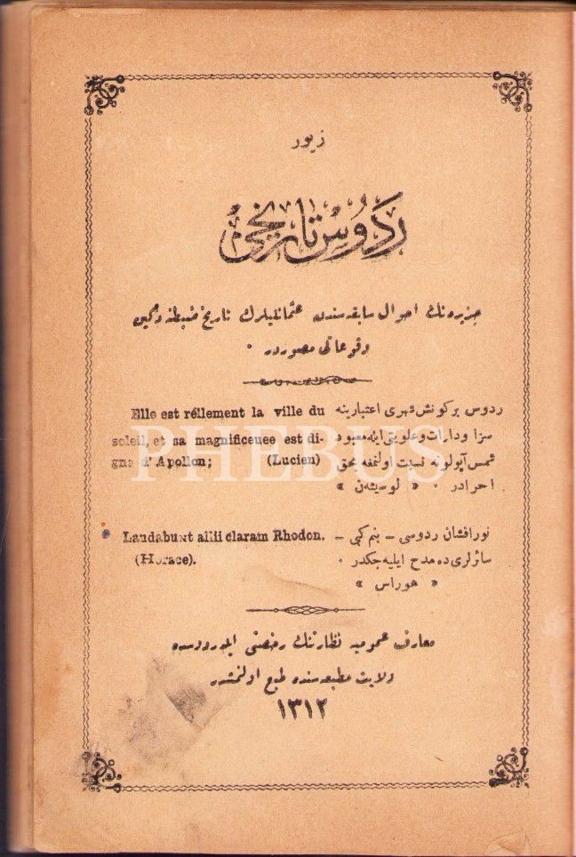 Osmanlıca Rodos Târîhi (Cezîrenin Ahvâl-i Sâbıkasından Osmanlıların Târîh-i Zabtına Değin Vukûâtı Musavvirdir), Ziver Bey, Vilayet Matbaası, 1312, 160 s., 13x19 cm, bazı sayfaları yıpranmış haliyle