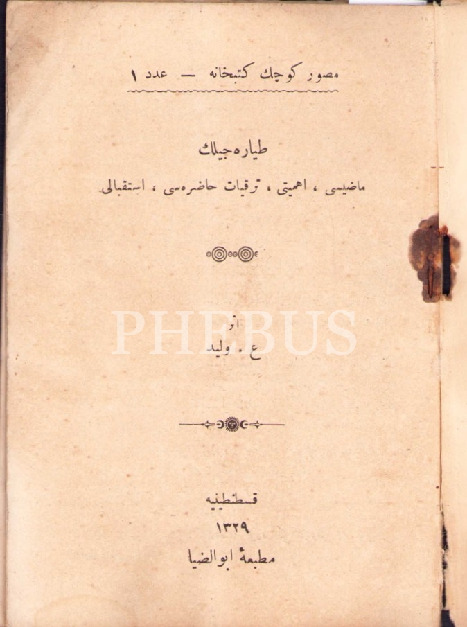 Osmanlıca Tayyarecilik-Mâzîsi, Ehemmiyeti, Terakkiyât-ı Hâzıresi, İstikbâli, A. Velid, Ebuzziya Matbaası, Kostantiniyye 1329, 72 s., 11x16 cm, sayfaları açılmamış ve kapağı yıpranmış haliyle
