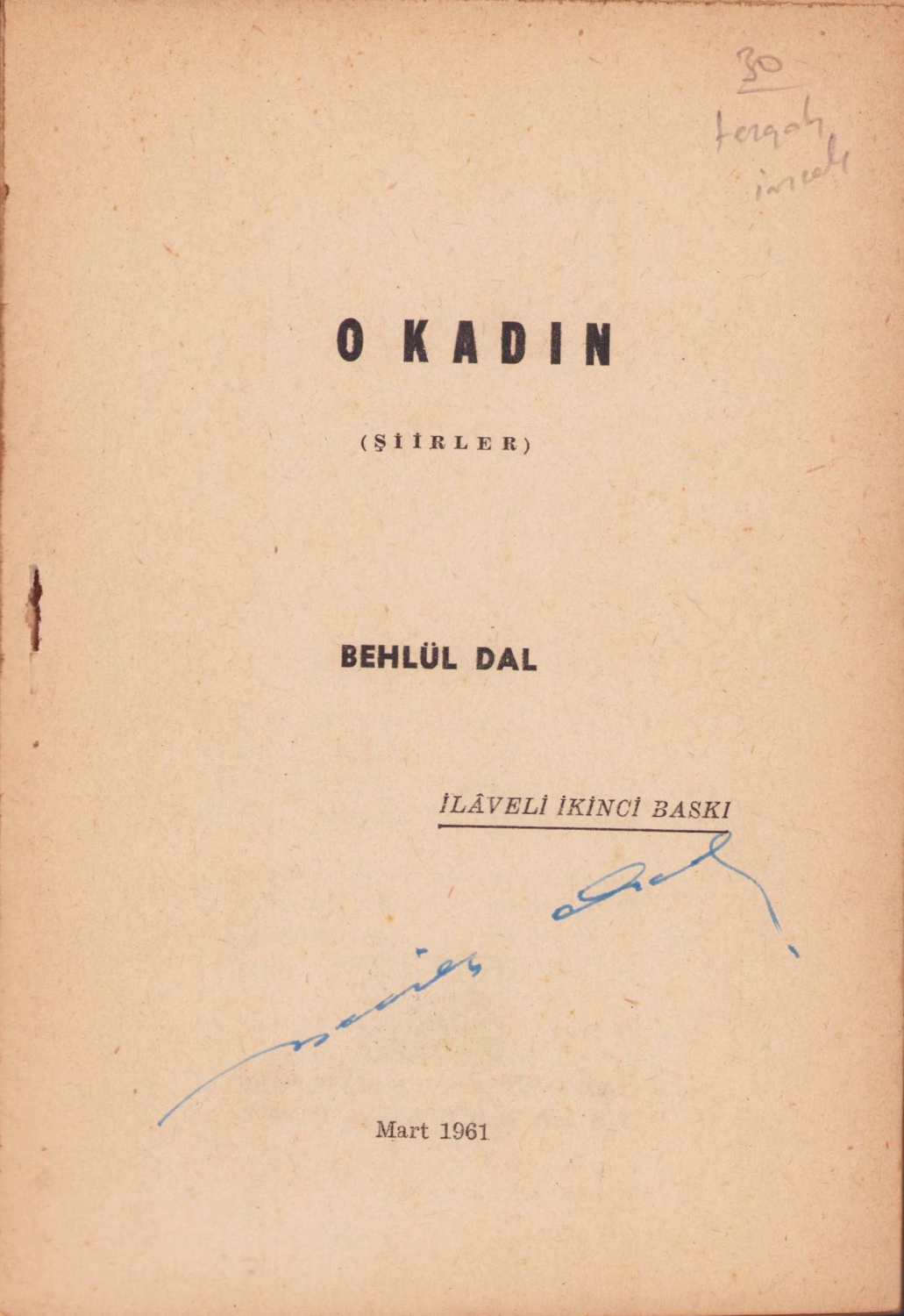 O Kadın - Şiirler, Behlül Dal, İlaveli ikinci baskı, 1961, yazarından imzalı, 63 sayfa, 14x20cm