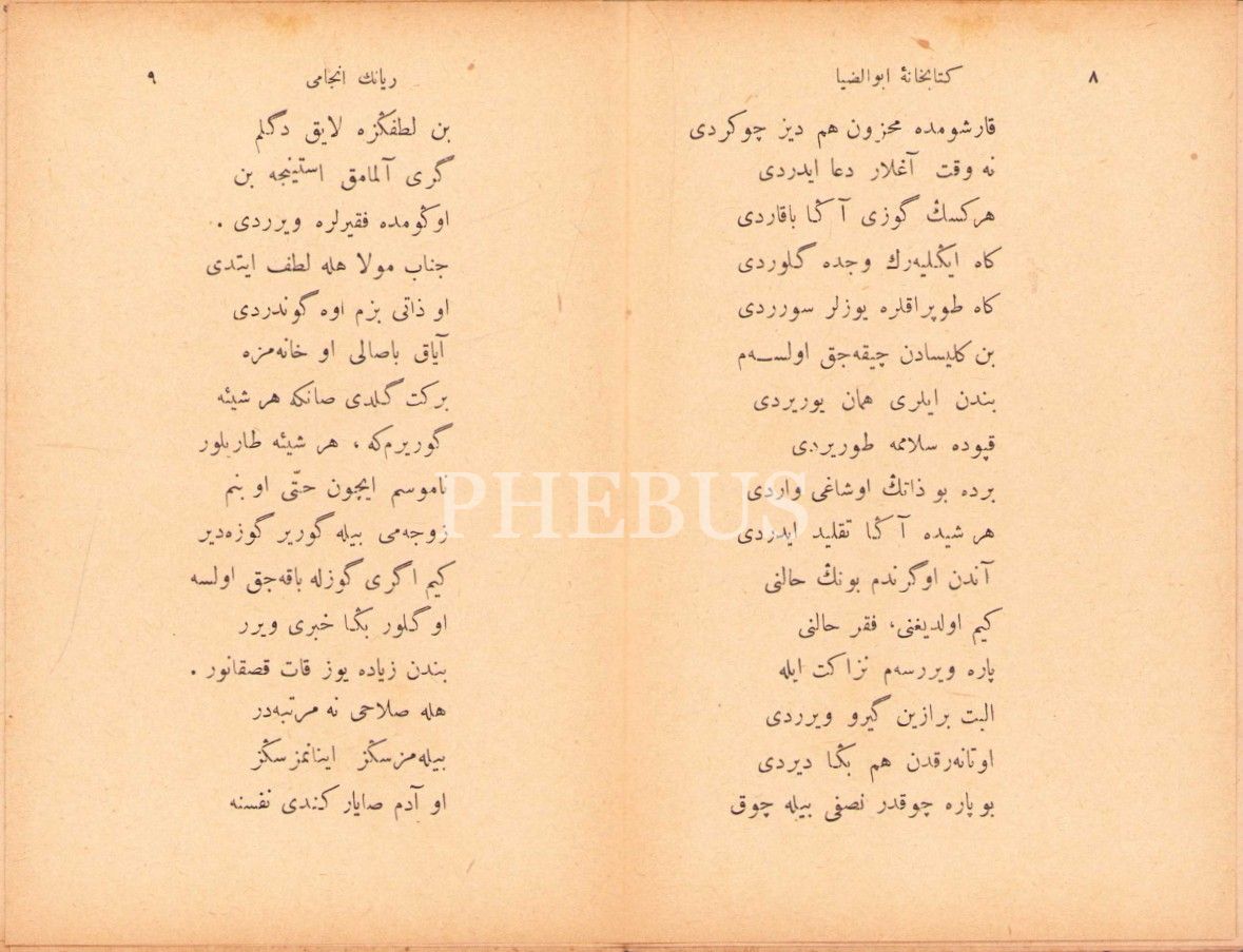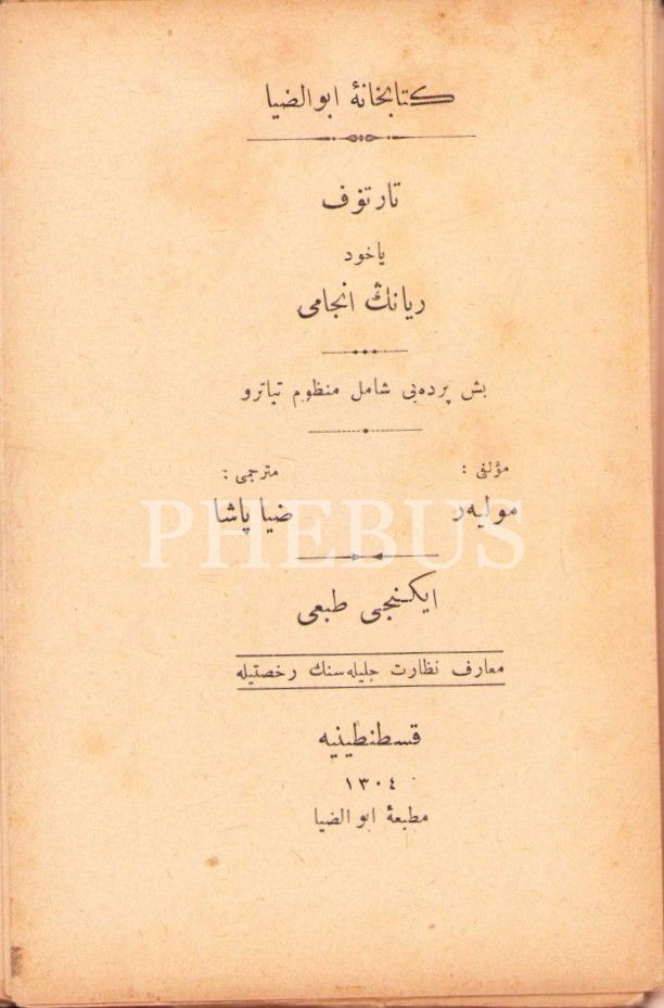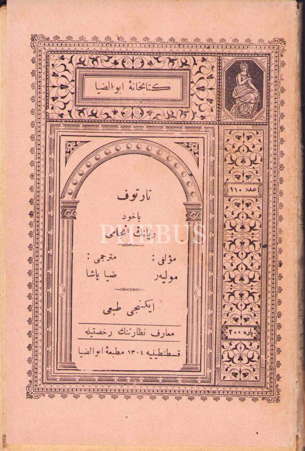 Osmanlıca Tartuffe Yâhûd Riyânın Encâmı, Moliere, çev. Ziya Paşa, Ebuzziya Matbaası, Kostantiniyye 1304, 180 s., 11x15 cm, sayfaları açılmamış, dağınık ve kapağı yıpranmış haliyle
