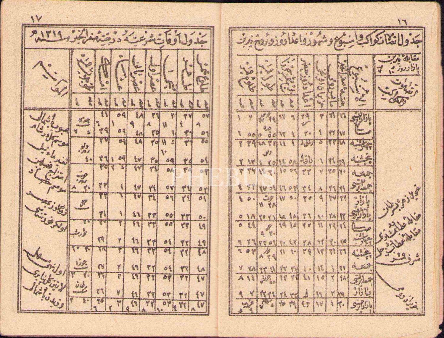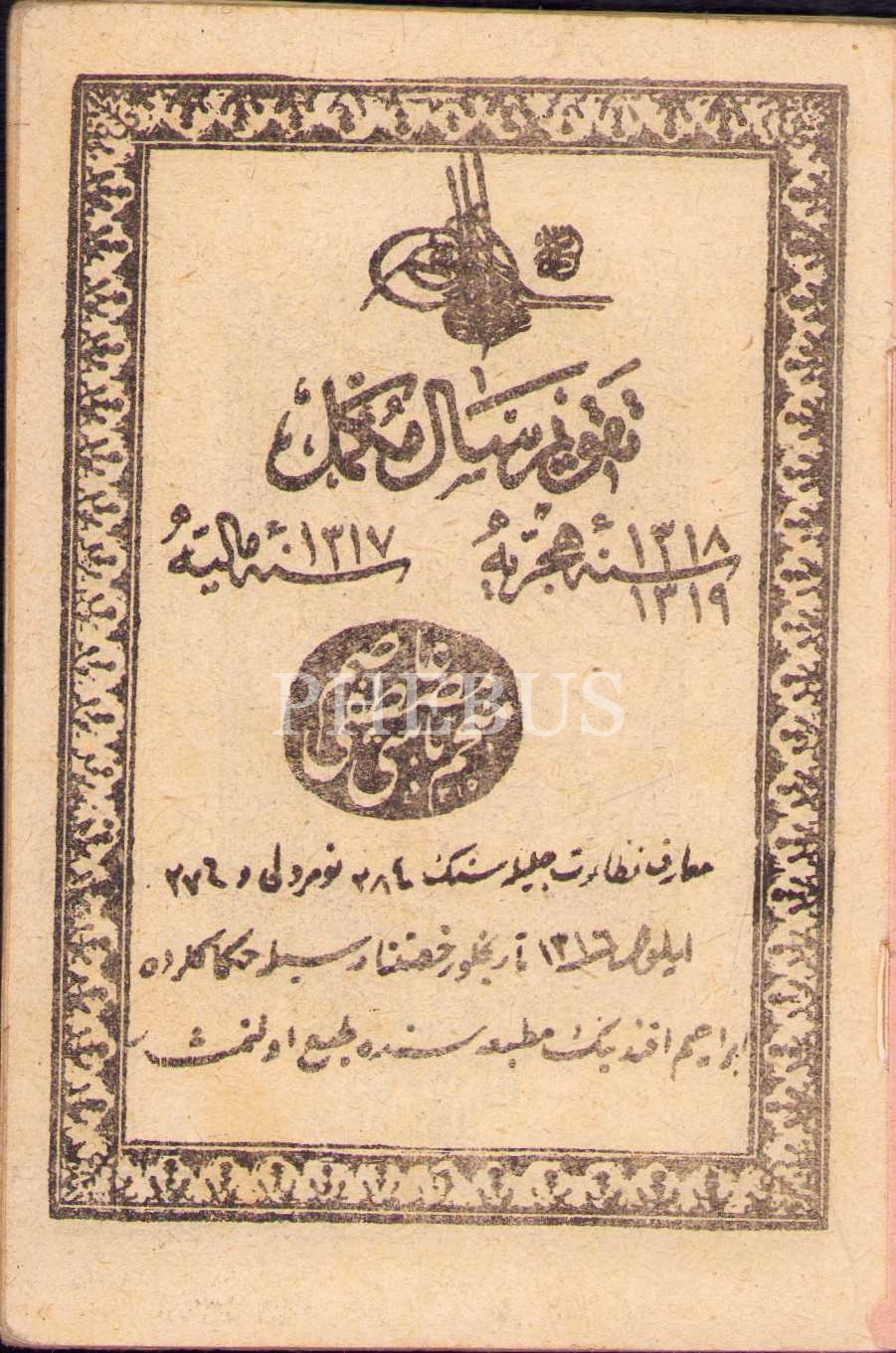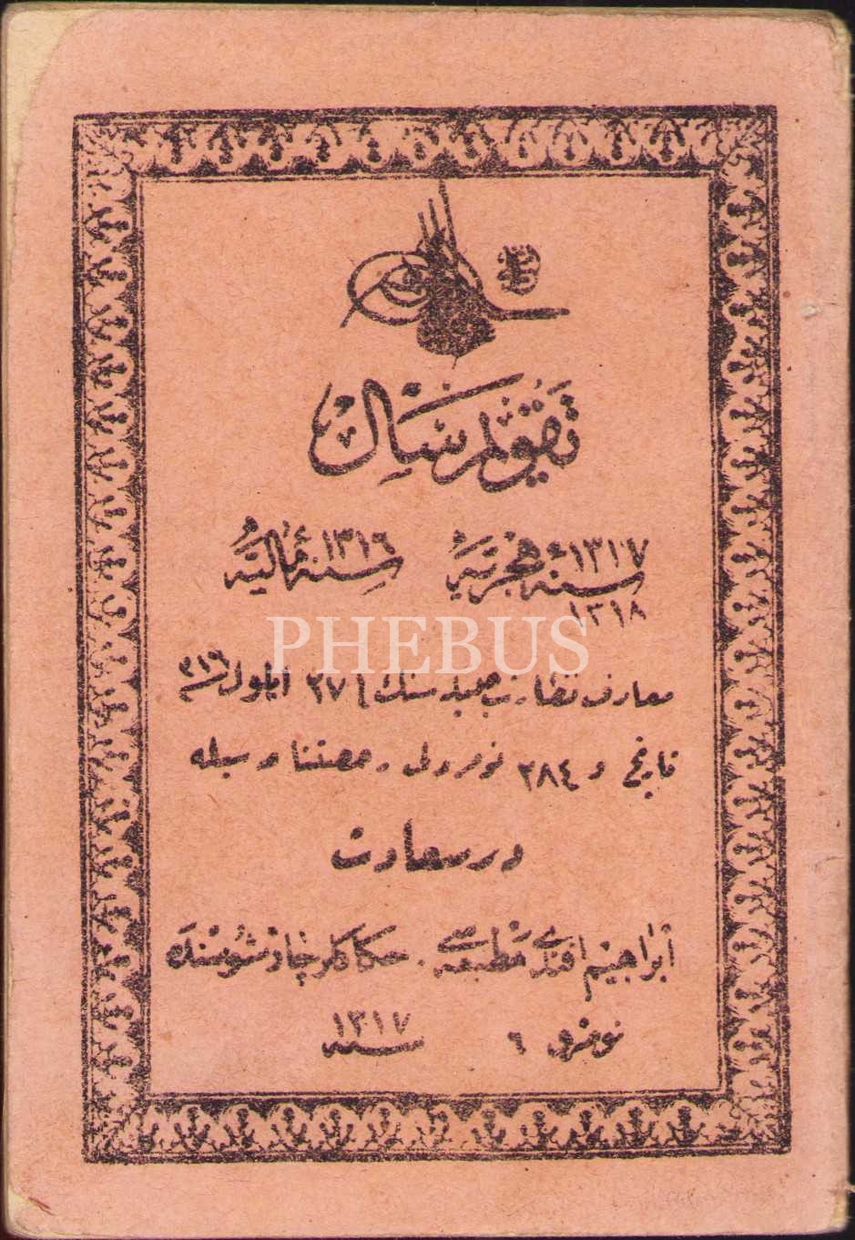 Osmanlıca Takvîm-i Sâl (1316 Mâlî Sene-1317 Hicrî Sene), İbrahim Efendi Matbaası, Dersaadet [İstanbul], 64 s., 8x11 cm, kapak sayfası hafif yıpranmış haliyle