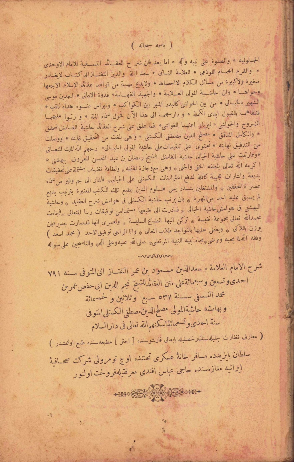 Haşiyetül Kesteli Ala Şerhul Akaid ve Haşiyetül Behişti Alel Hayali, 1326, Arapça, mevcut iki kitap bir arada, ciltte kopukluk var haliyle, 310 sayfa, 15x24cm