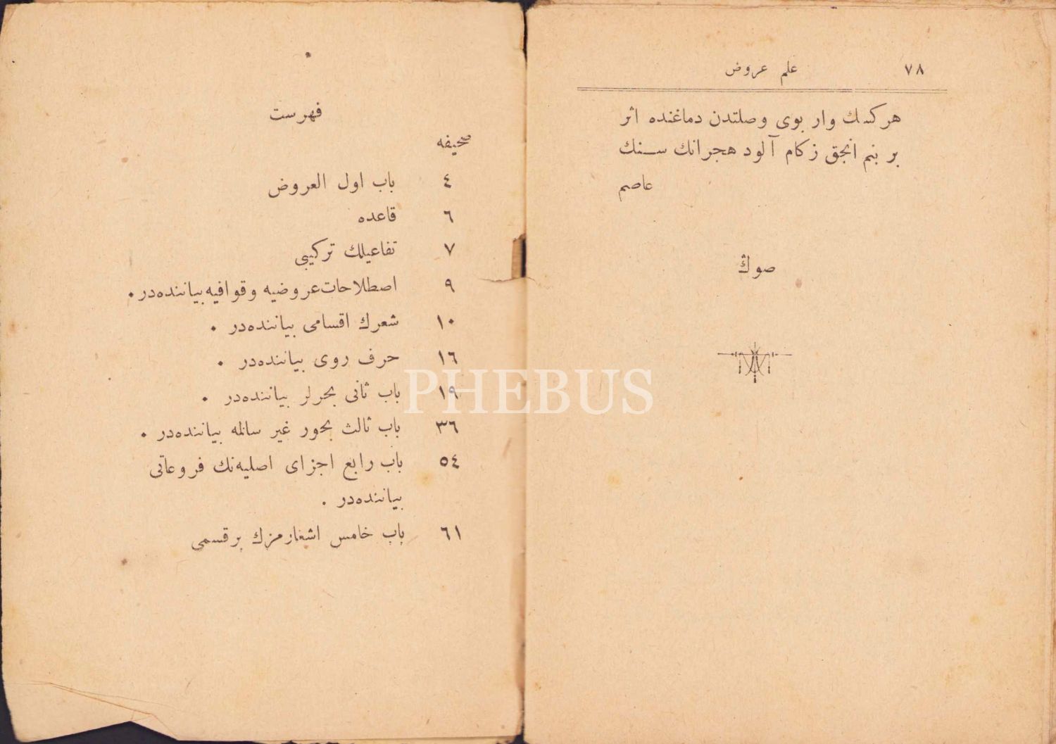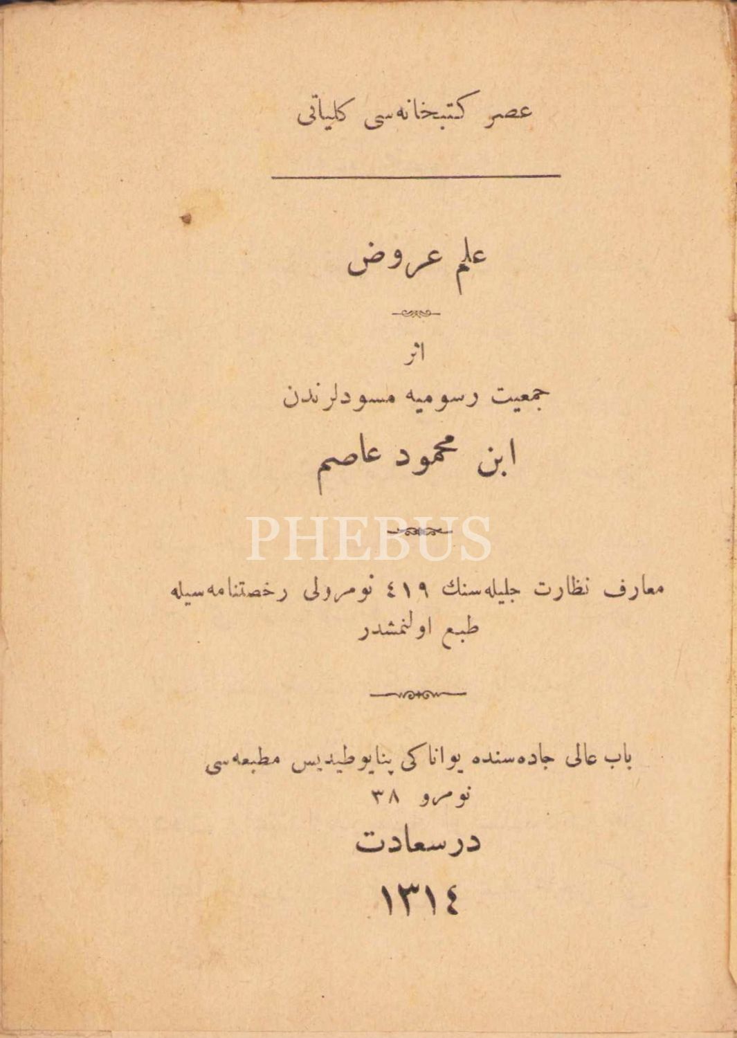 İlm-i Aruz, İbni Mahmud Asım, Dersaadet - Asır Kütüphanesi, 1314, Osmanlıca, cilt yıpranmış, 78 sayfa, 10x14cm