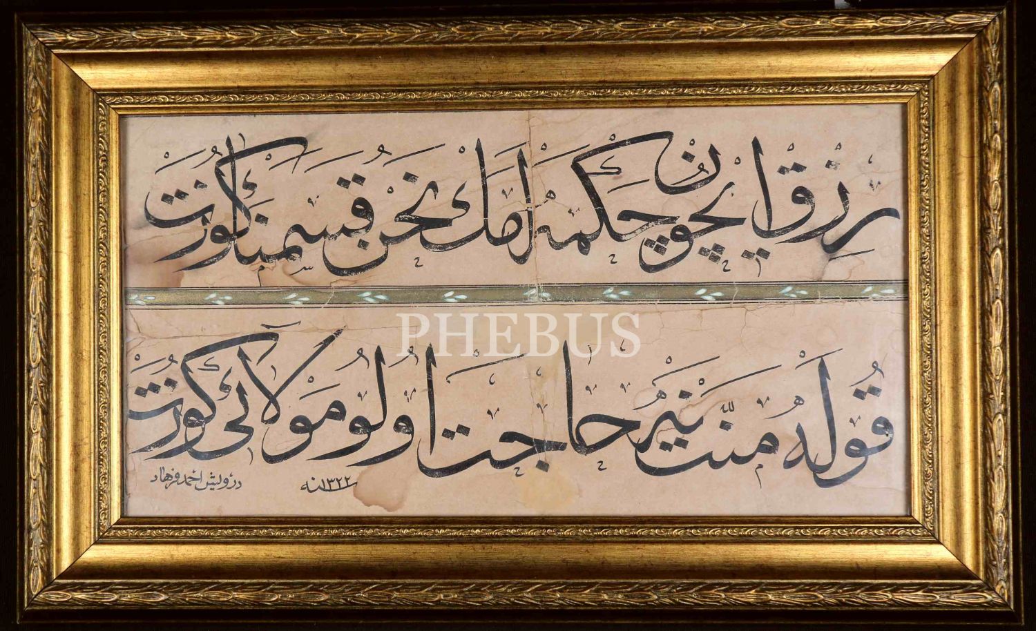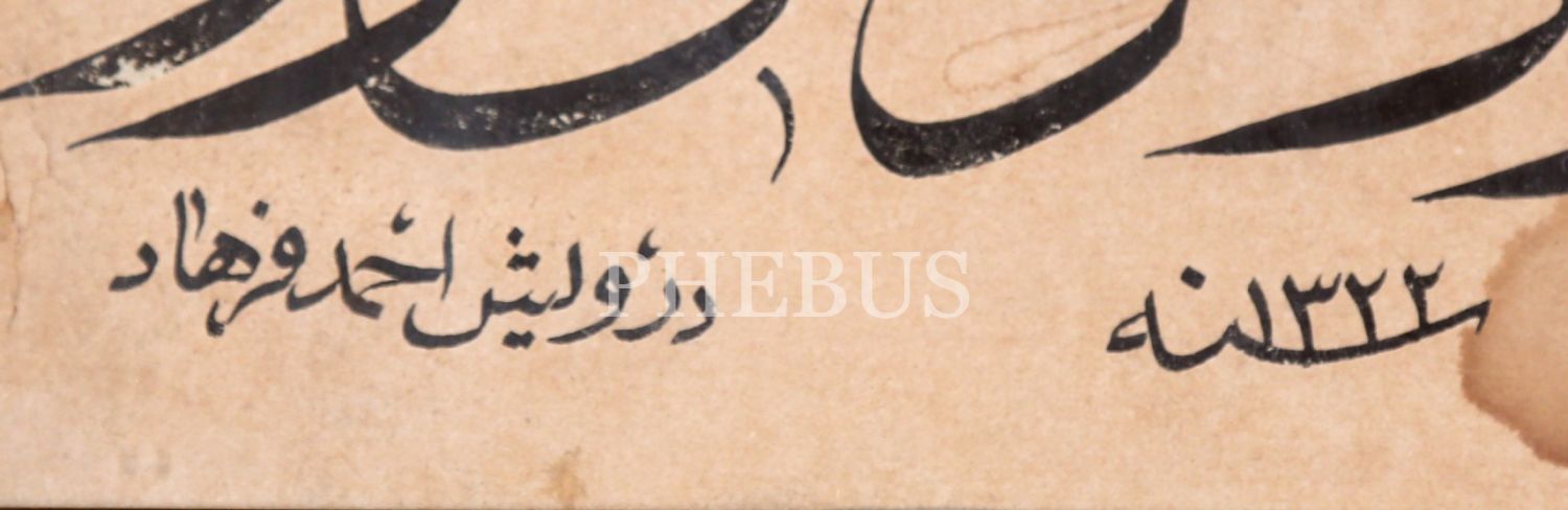 Sülüs Beyit: Rızk için çekme emek "Nahnü kasemna" gözet, Kula minnet neye hacet Ulu Mevla'yı gözet”, “Derviş Ahmed Ferhad" ketebeli, 1322 târihli, çerçeveli, yazı 38x22 cm
