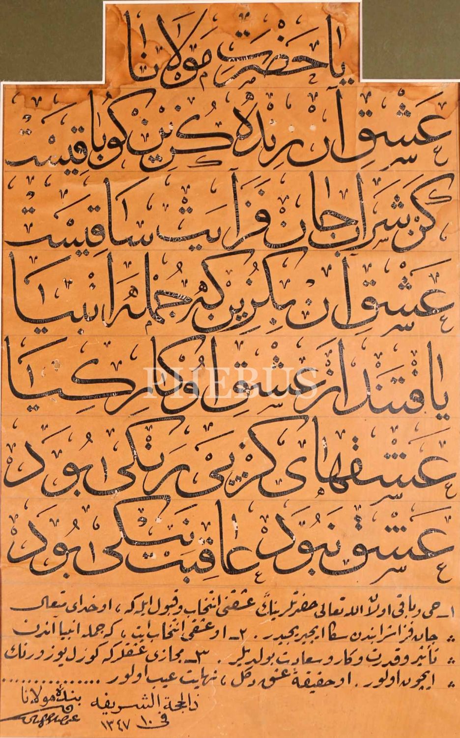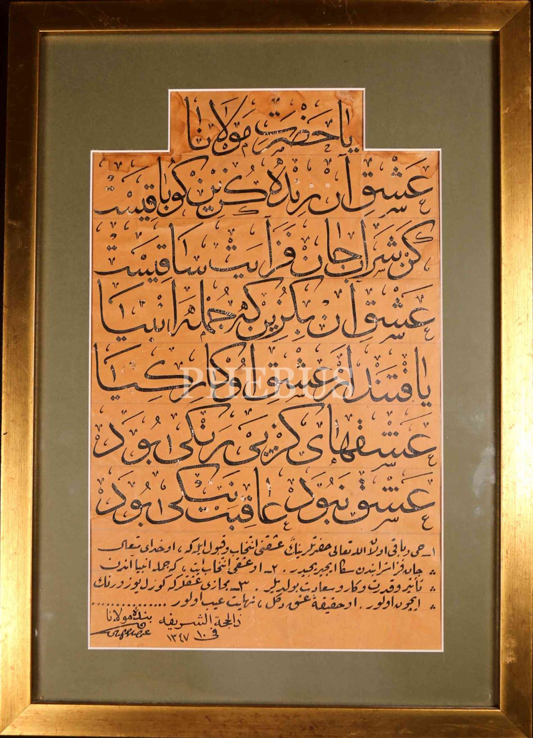 Celî Nesih Levha, "Ya Hazret-i Mevlânâ", "Bende-i Mevlânâ Osman" ketebeli, 1347 tarihli, yazı 23x37 cm