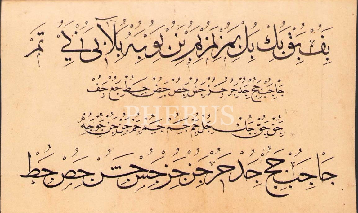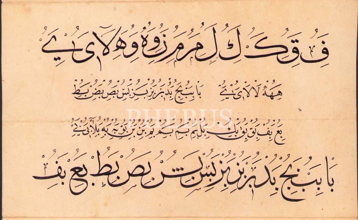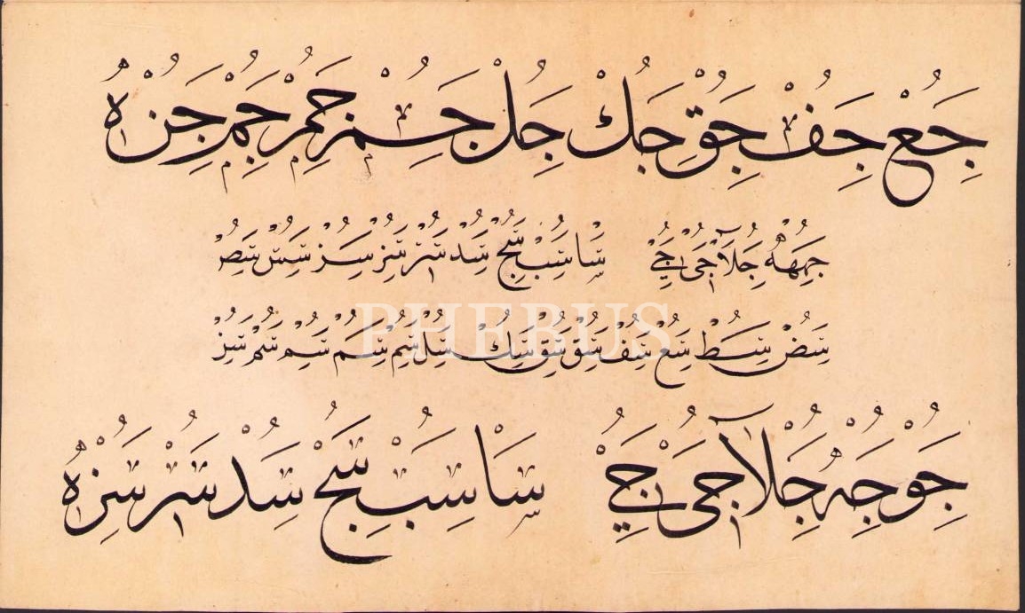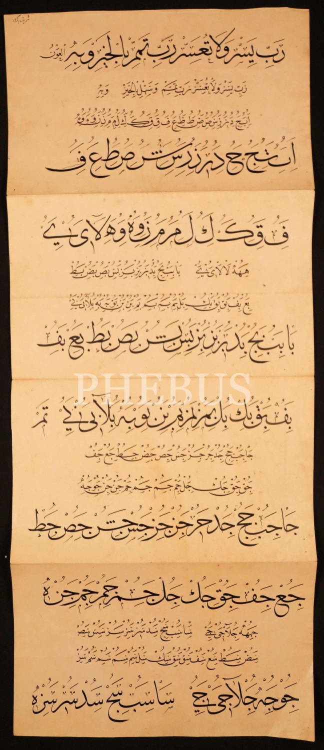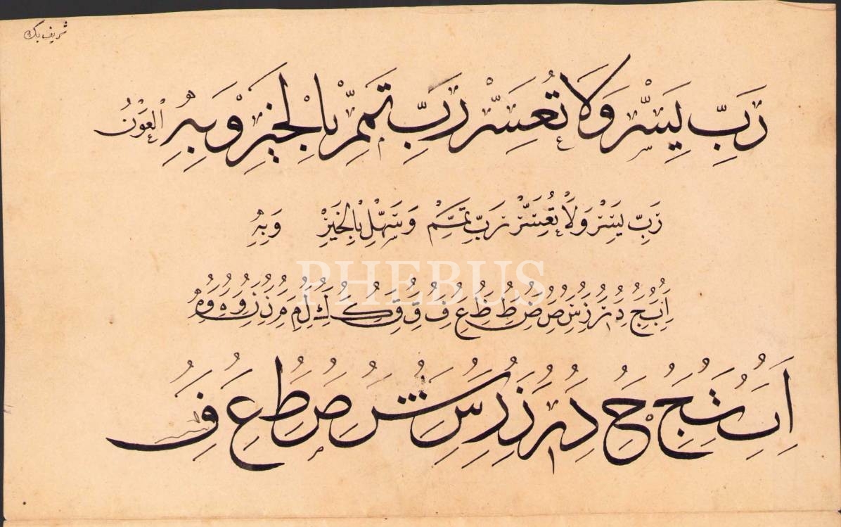 Sülüs Nesih "Rabbi Yessir" ve "Hurufat Meşki", sol üst köşede Osmanlıca "Şerif Bey" yazılı, birleşik hâlde dört parça, 23x52 cm