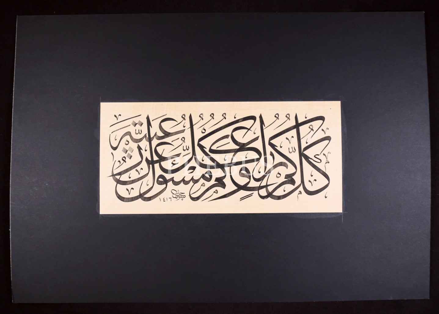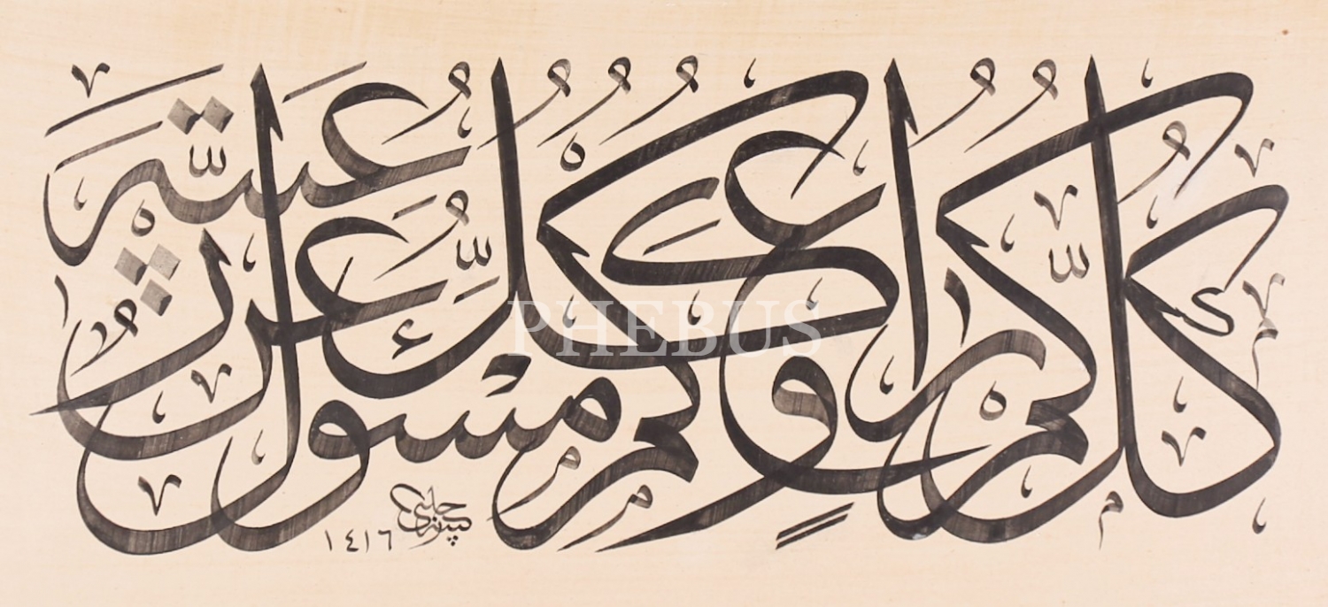 Hattat Hasan Çelebi'nin Sülüs Hadis-i Şerif: “Hepiniz çobansınız ve hepiniz raiyetinizden/sorumlu olduklarınızdan mesulsünüz.” 1426 tarihli, 33x16 cm