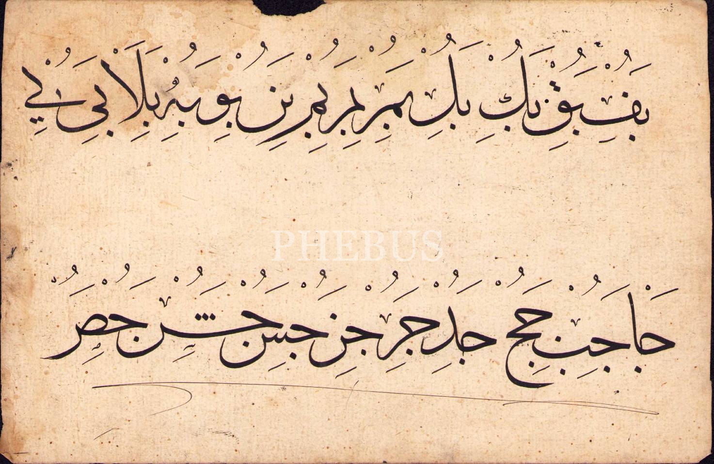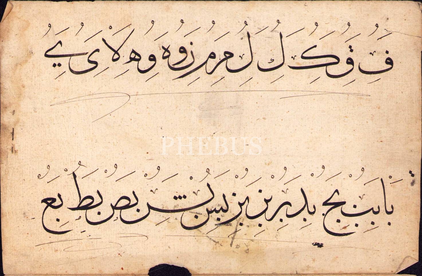 Hoca İşi Sülüs Hurufat Meşki, arkasında Osmanlıca "Galata Saray'ın Derviş Mehmed" yazılı ve Osmanlıca "Temmuz 1956 Necmeddin Hoca'dan" yazılı, 22x30 cm