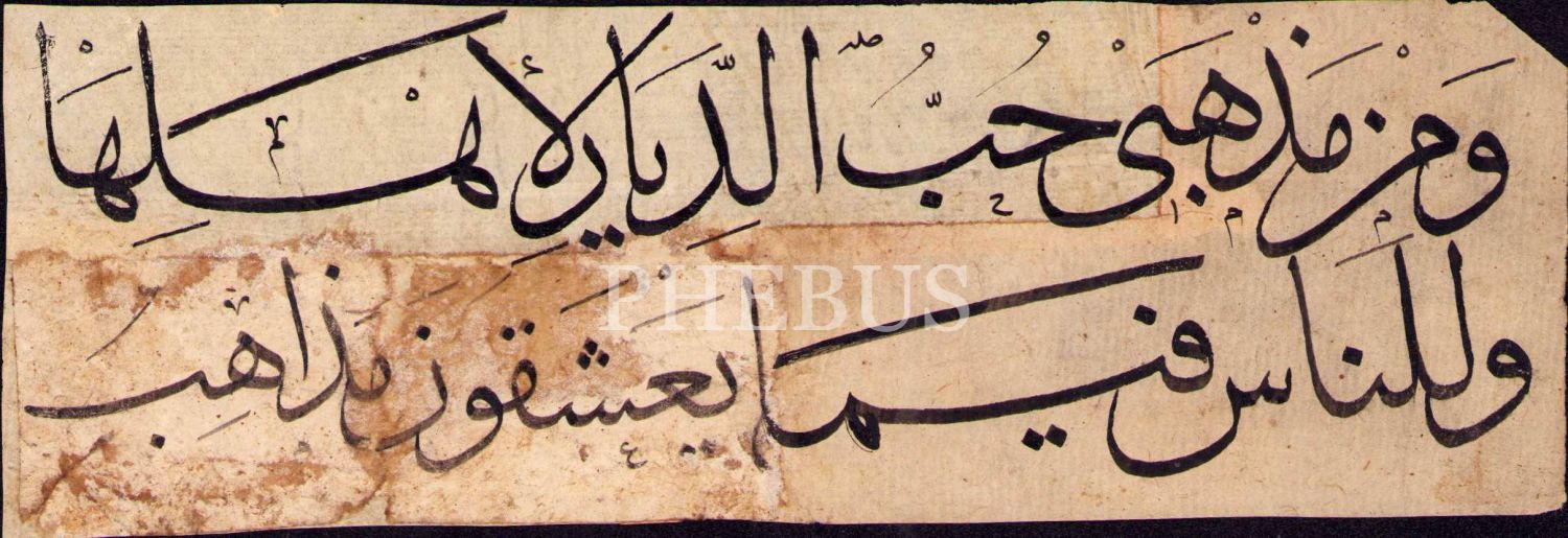 Hoca İşi Sülüs Yazı ile Arapça Beyit: “ Benim Meşrebim, Bir Diyârı İçinde Yaşayanlar için Sevmektir.” 21x7 cm