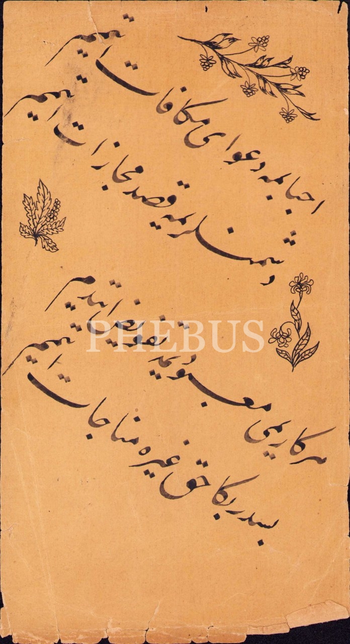 Farsça Ta'lik Mâil Kıta, "Ahbabıma dava-yı mükâfat etmem", hâliyle 14x26 cm