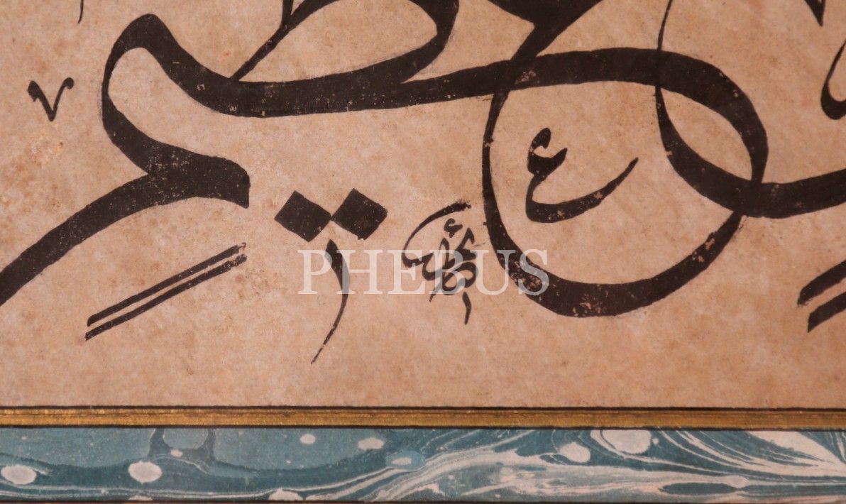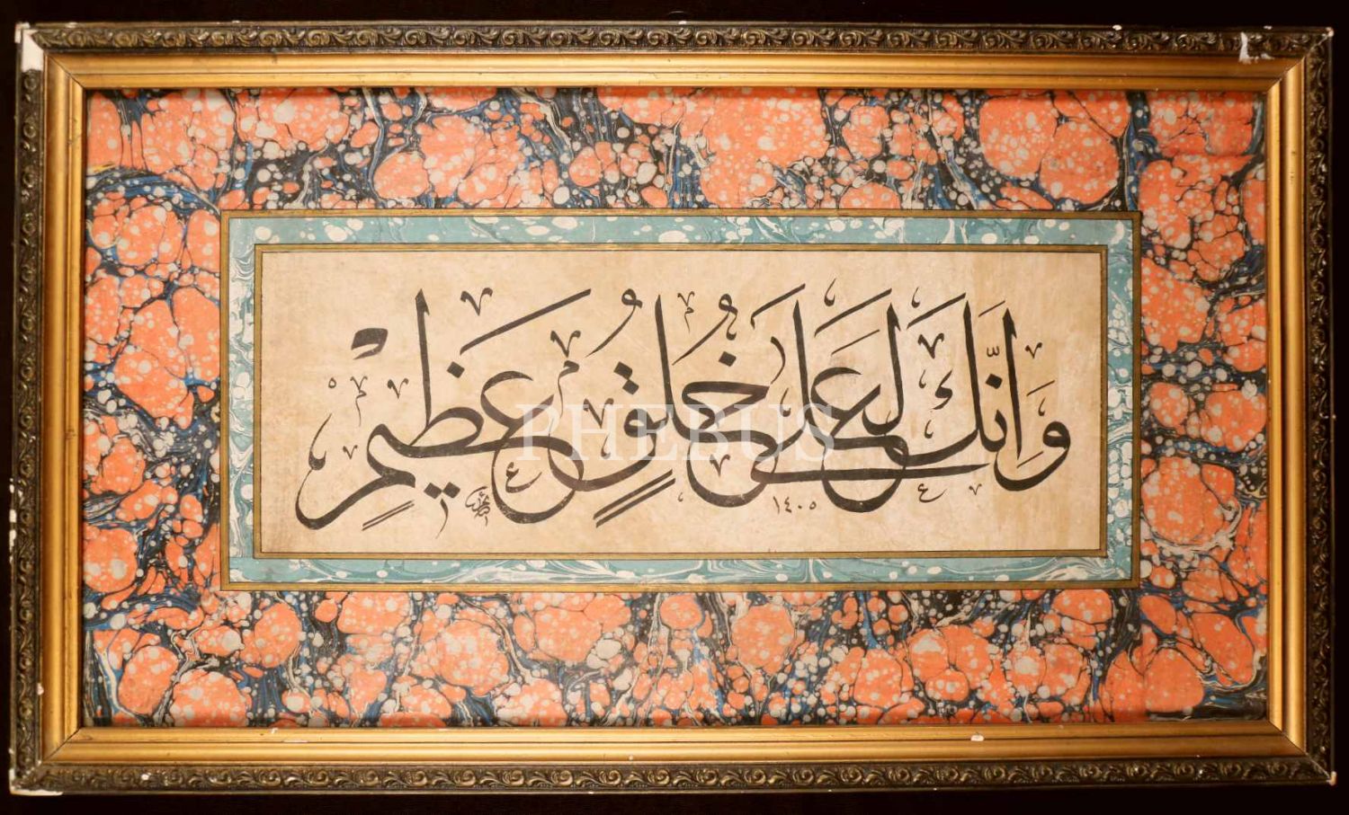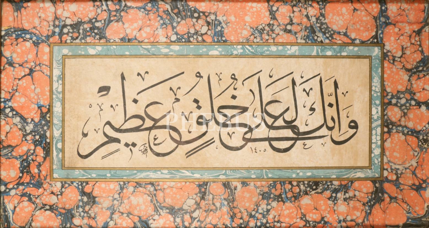 Celî Sülüs Ayet-i Kerime, "Şüphesiz sen büyük bir ahlak üzeresin", Kalem Suresi'nden, Sâim [Özel] ketebeli, etrafı ebrulu, 1405 tarihli, yazı 37x13 cm