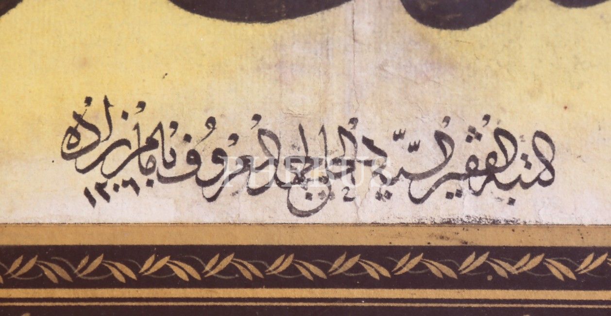 Celî Sülüs İğneli Kalıp, "el-Hac İmamzâde" ketebeli, 1206 tarihli, etrafı tezhipli, çerçeveli, kalıp 37x30 cm