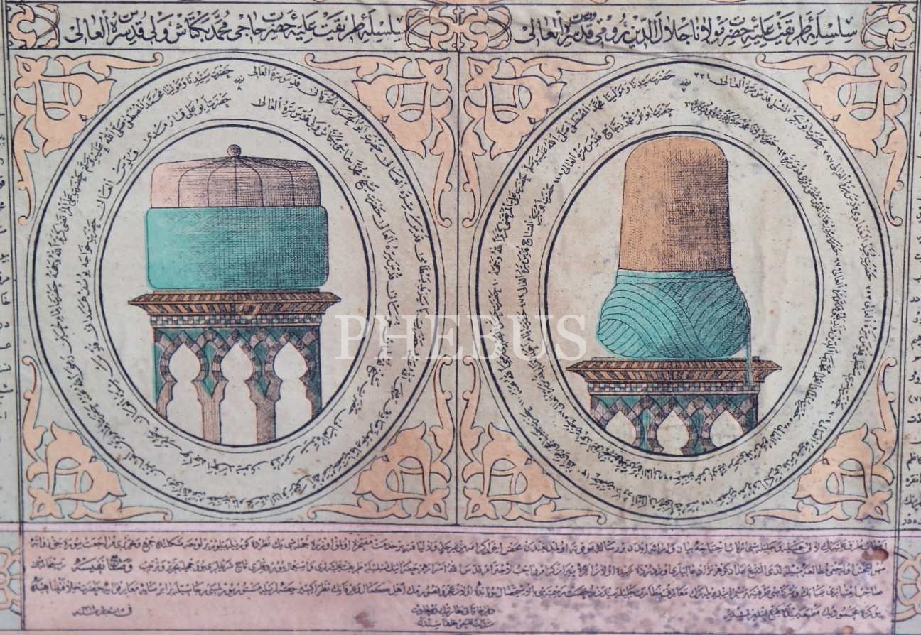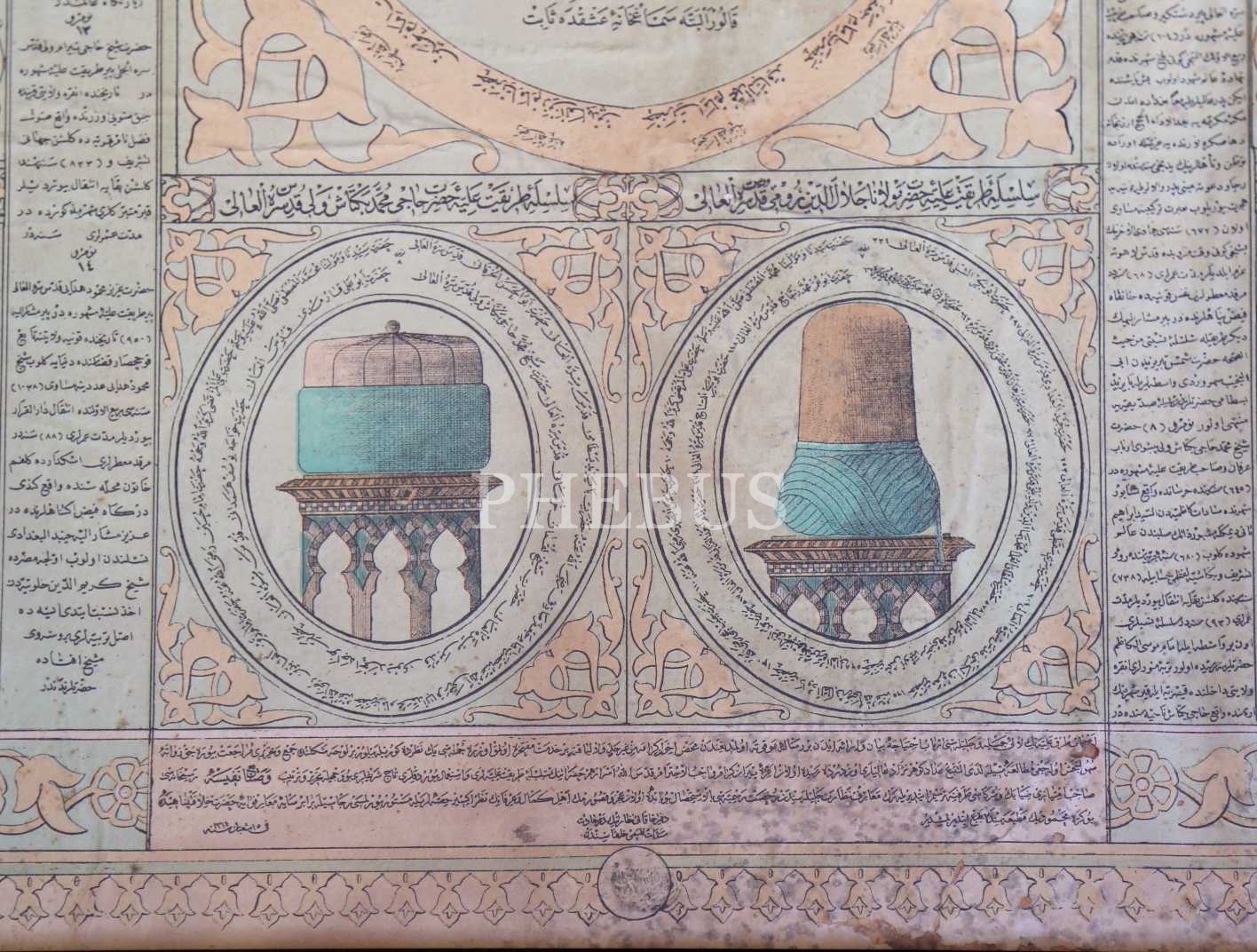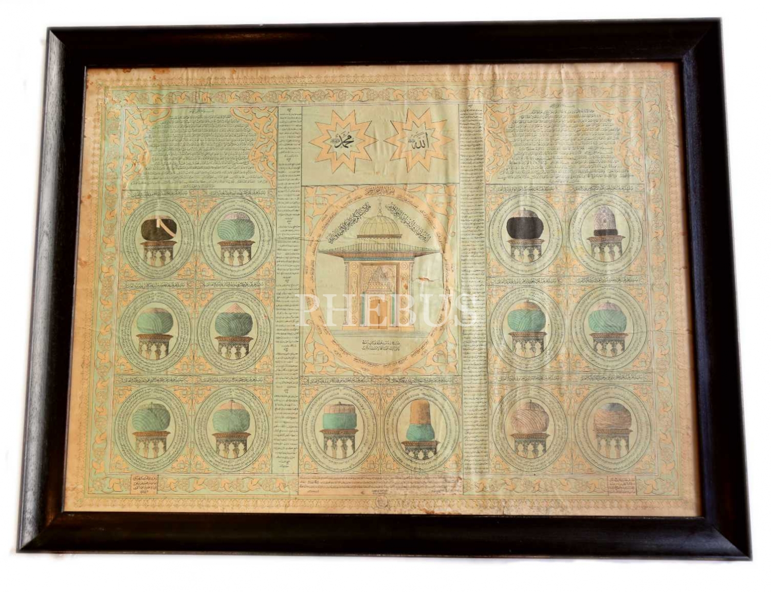 Osmanlı Dönemi Taş Baskı Tarîkat Tâc-ı Şerifleri Levhası, 12 Tarîkate Âit Tâc-ı Şerifler Hakkında Malumat, Maarif Nezâreti'nin ruhsatıyla basılmış, 1314 tarihli, Defter-i Hakani Nezareti'nin Dersaadet Senedat Kalemi Hulefasından, 85x65 cm