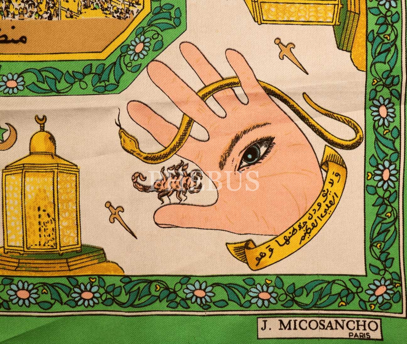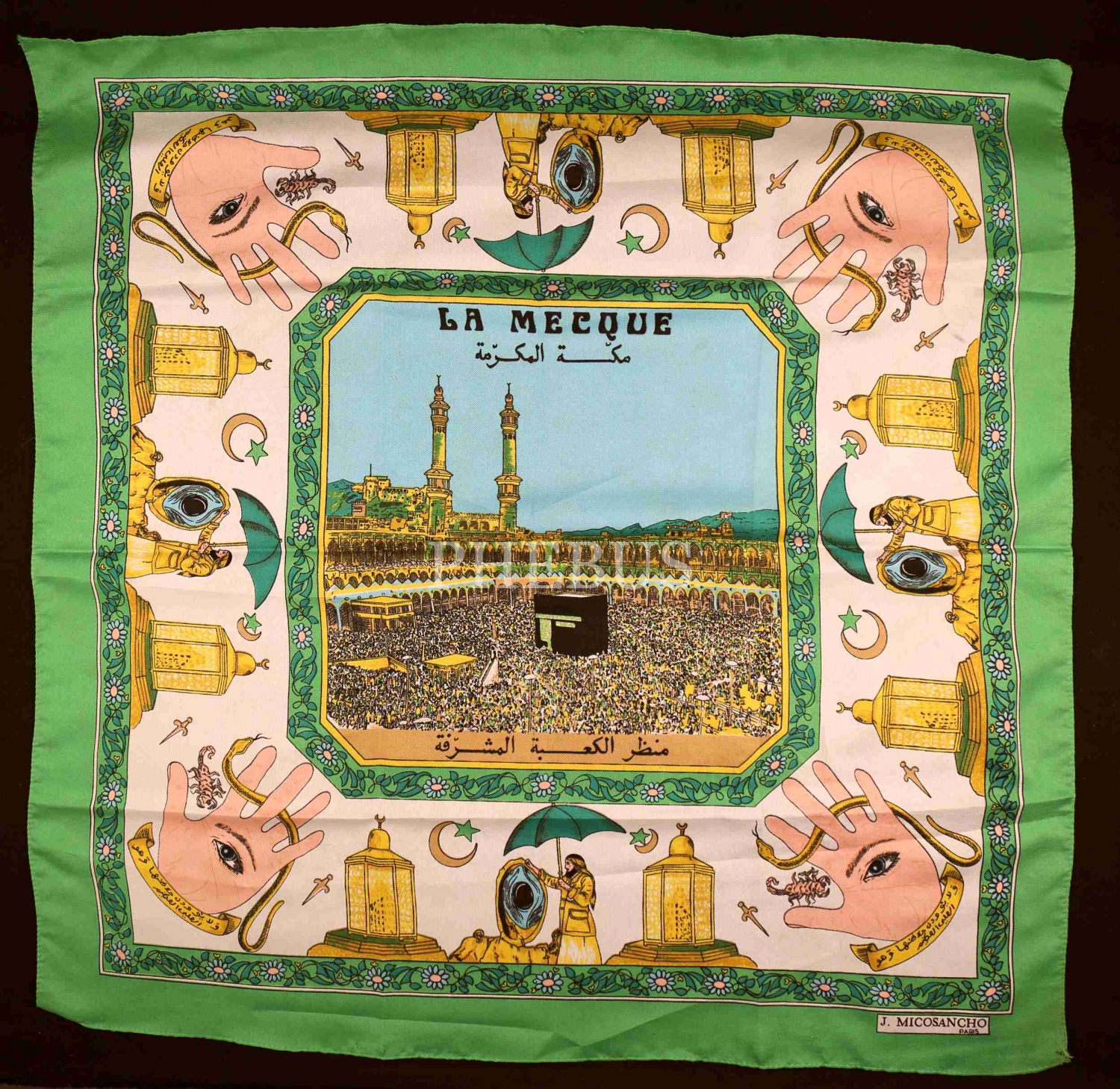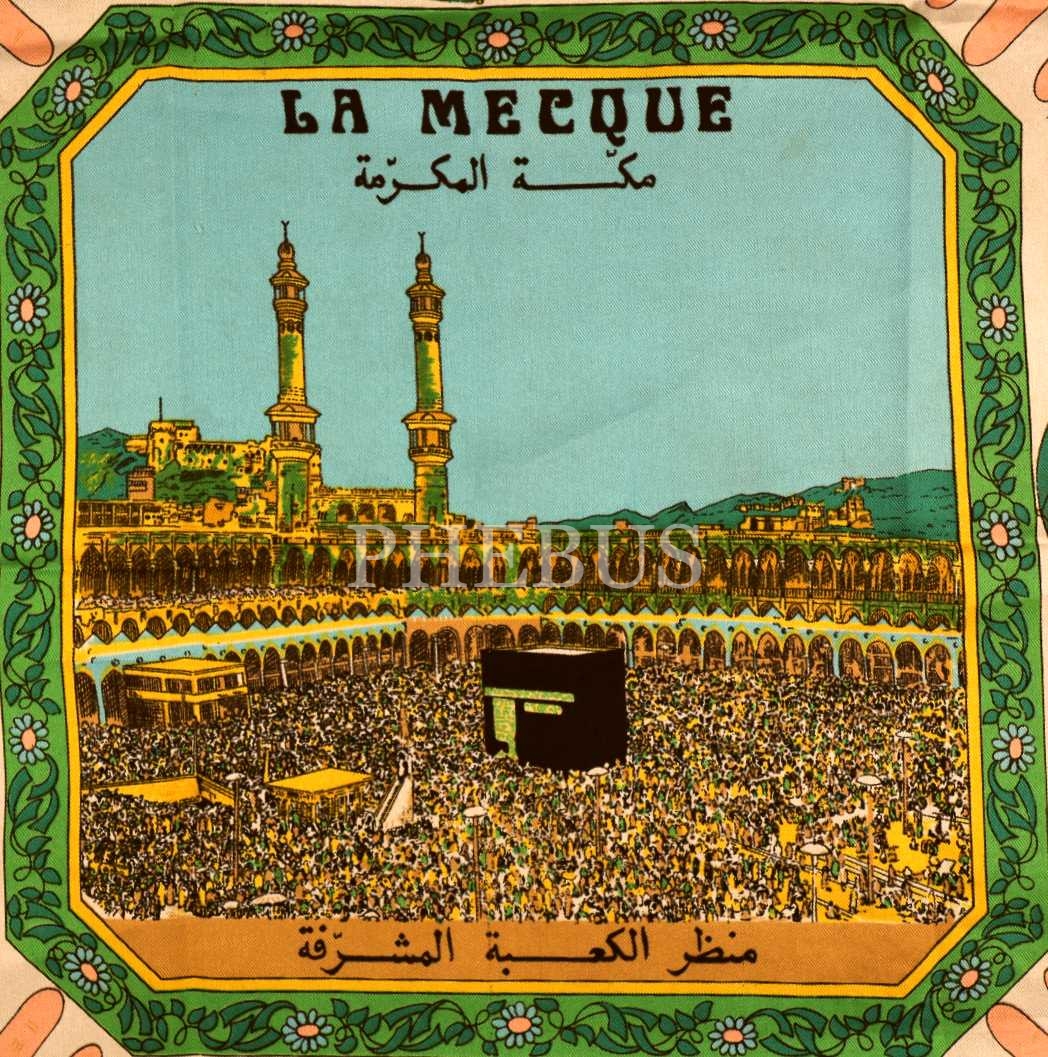 "Kâbe-i Muazzama" İpek Mendil, J. Micosancho Paris, Arapça Mekke-i Mükerreme Fransızca "La Mecque" yazılı, 55x55 cm