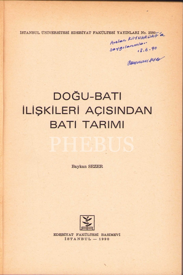 Sosyolog Baykan Sezer'den Felsefeci Arslan Kaynardağ'a İthaflı ve İmzalı "Doğu-Batı İlişkileri Açısından Batı Tarımı", İÜ Edebiyat Fakültesi Yayınları, 1990, 138 sayfa, kapağı yorgun haliyle, 16x24 cm